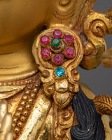 This Manjushri Holding Sword Statue is crafted from copper and gilded with 24K gold, showcasing exceptional craftsmanship. The gold and acrylic paintings bring out the fine features of his flowing robes, tranquil countenance, and delicately carved lotus throne.