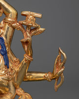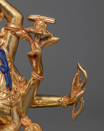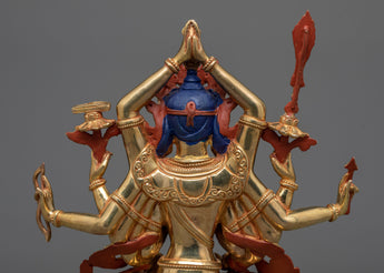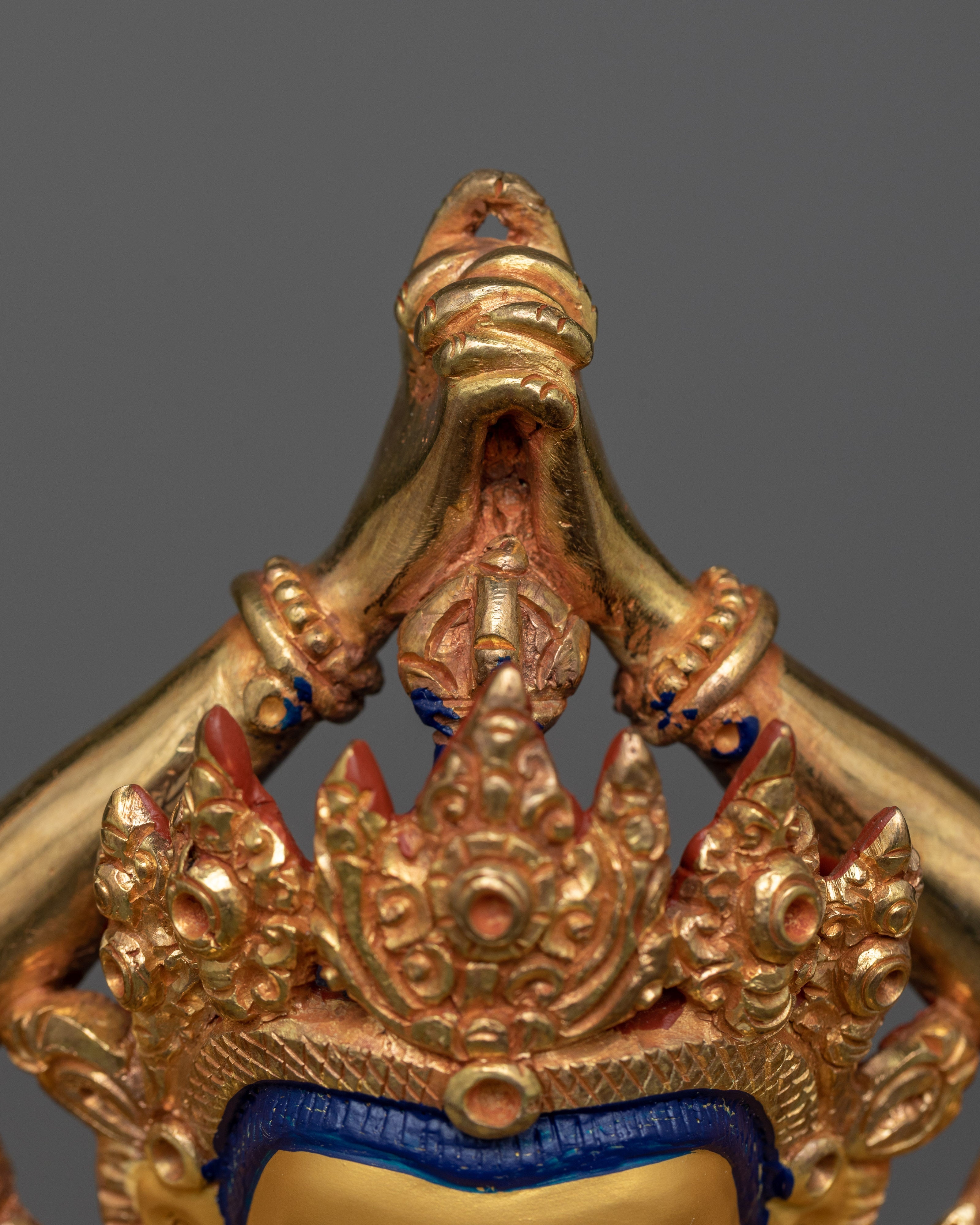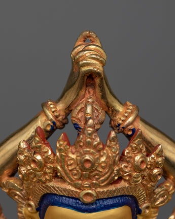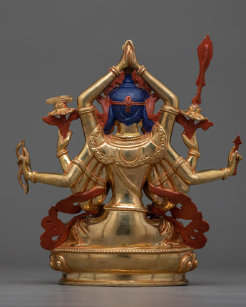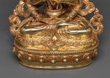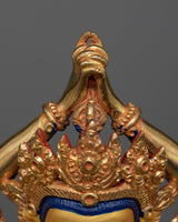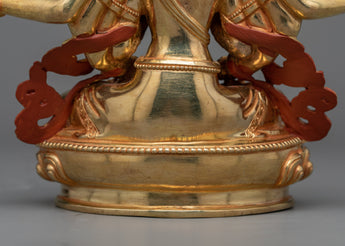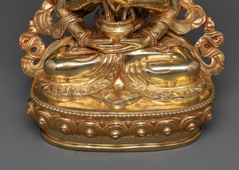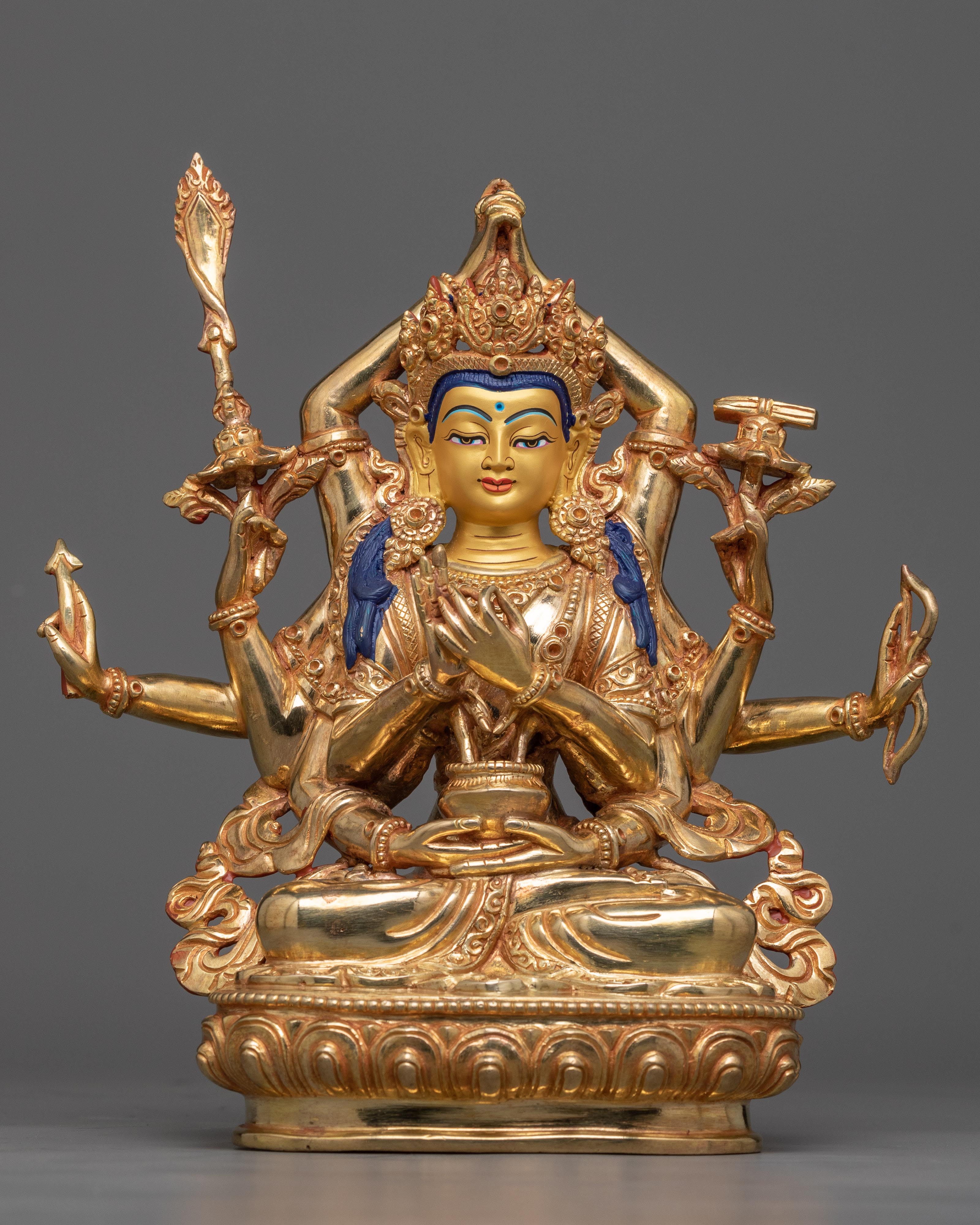Expertly crafted from a copper body, the statue is meticulously gilded in 24K gold, highlighting its sacred presence. The combination of gold and acrylic paintings brings to life the intricate details of Manjushri, from his peaceful yet profound expression to the symbolic sword and book he holds. The statue’s presence in your space symbolizes the pursuit of enlightened understanding and the wisdom inherent in Buddhist philosophy.