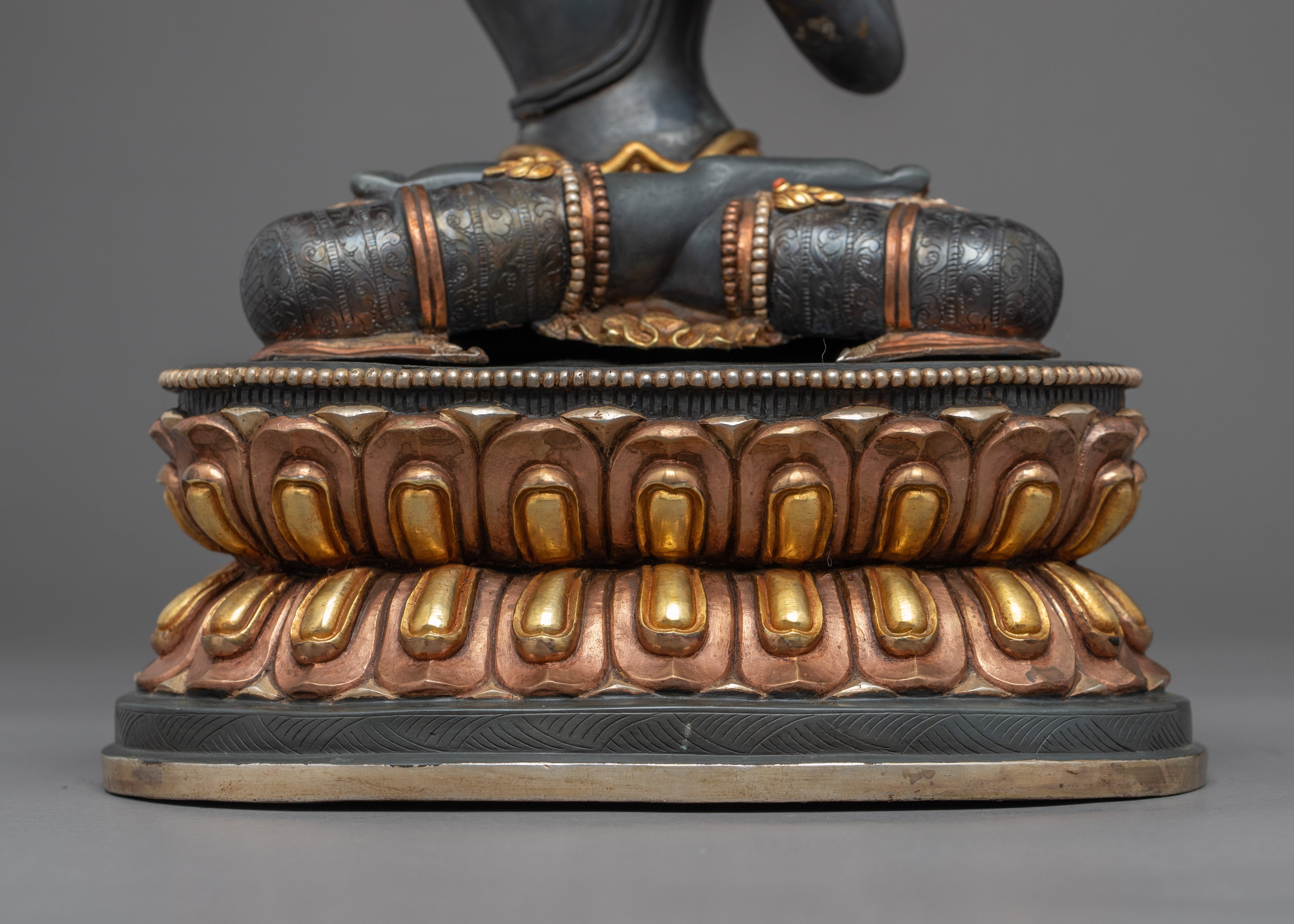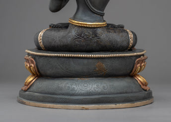 The Manjushri Practice Statue was beautifully carved by the artists of Nepal with traditional vajra techniques that have been passed down for generations in our studio. The perfectly carved figure was carved from a copper body, gilded with 24k genuine gold and finely painted with acrylic paint to highlight the detail patterns. The statue depicts the deity seated upon a moon disc lotus with a peaceful expression as she holds the sword of wisdom above his head. The statue is beautifully decorated with numerous body ornaments which are embedded with precious jewel stones. The sculpture took our artists months of hard work to complete, it can be used in various different Buddhist rituals and your everyday meditational practices.