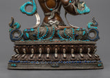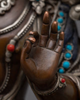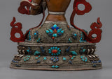 Manjushri is traditionally depicted wielding a flaming sword in his right hand, representing the sharpness of wisdom that cuts through the darkness of ignorance, and holding the Prajnaparamita sutra in his left, symbolizing his mastery over the ultimate reality. The intricate blend of silver plating with gold and acrylic paintings brings a luminous quality to his divine form, creating a striking visual contrast that enriches any spiritual setting. The hand-carved gemstones add beauty and significance, enhancing the sculpture's ability to inspire meditation and reflection on the virtues of wisdom, insight, and enlightened understanding.