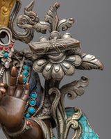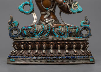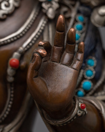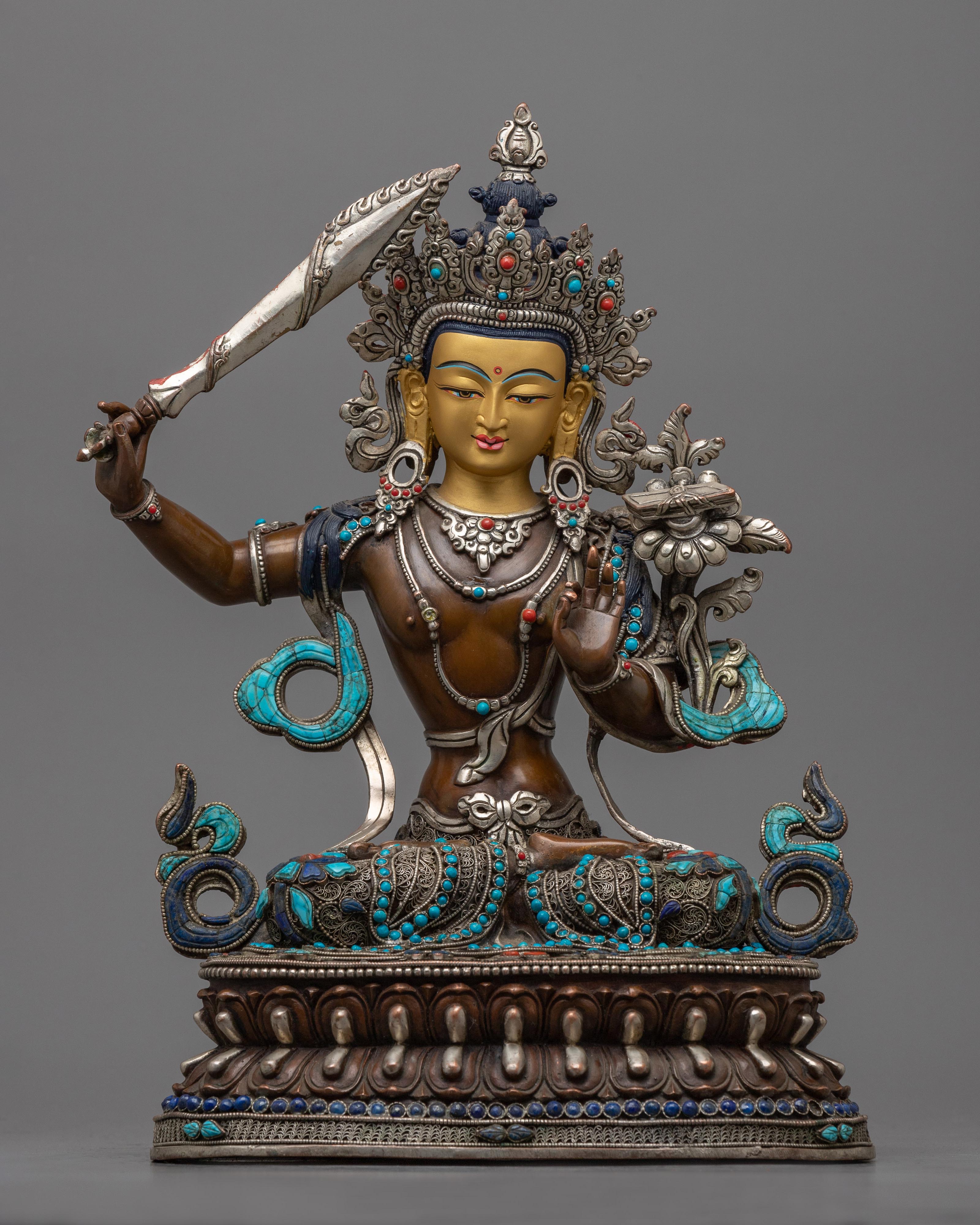 Presenting the Manjushri Sculpture with Gemstones: a representation of the Bodhisattva of Wisdom, known for his capacity to eliminate ignorance and shed light on the way to enlightenment, Manjushri is a stunning figure. This sculpture, which weighs 3.84 kg and has a commanding height of 13.7 inches on a base of 9.8 inches, perfectly captures the essence of Manjushri's infinite wisdom and enlightened intellect. This item, which represents Manjushri's profound clarity and understanding, is crafted from an oxidized copper body for timeless elegance, ornamented with gold and acrylic paints, enhanced by silver plating, and studded with hand-carved jewels.