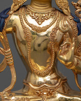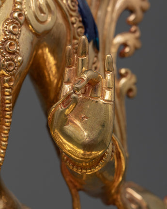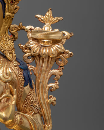 Presenting the Manjushri: The Bodhisattva of Wisdom Sculpture, a magnificent tribute to the Buddhist pantheon's representative of transcendent wisdom. This sculpture, which stands at a majestic 14.1 inches and rests on an 8.6-inch base, is a testament to Manjushri's profound clarity and enlightened intelligence. It weighs 5.24 kg. This sculpture, painstakingly constructed from a copper body and embellished with 24K gold gilding, detailed acrylic and gold paints, and other elements, perfectly encapsulates Manjushri's search for illumination and the truth.