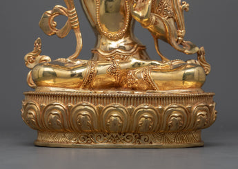 Manjushri is shown carrying the lotus of pure knowledge and brandishing the fiery sword of wisdom, which he uses to slice through ignorance and illusion. This iconic representation symbolizes his role in cutting through the darkness of misunderstanding and guiding beings toward the light of enlightenment. The intricate detailing of the sculpture, from the serene, knowing gaze to the dynamic flow of his robes, reflects the skilled artistry that brings the enlightened presence of Manjushri to life.
