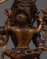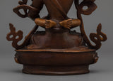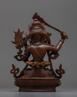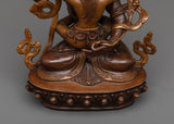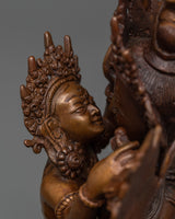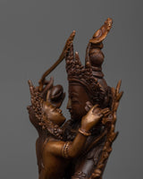 The artwork, made of oxidized copper, has an age-old fascination. The delicate features of Manjushri clutching the fiery sword of insight and his spouse embodying the energy of enlightened activity are highlighted by the dark, patinated finish. This piece combines beauty and spirituality in a seamless way, making it a great addition to any sacred altar or meditative place.