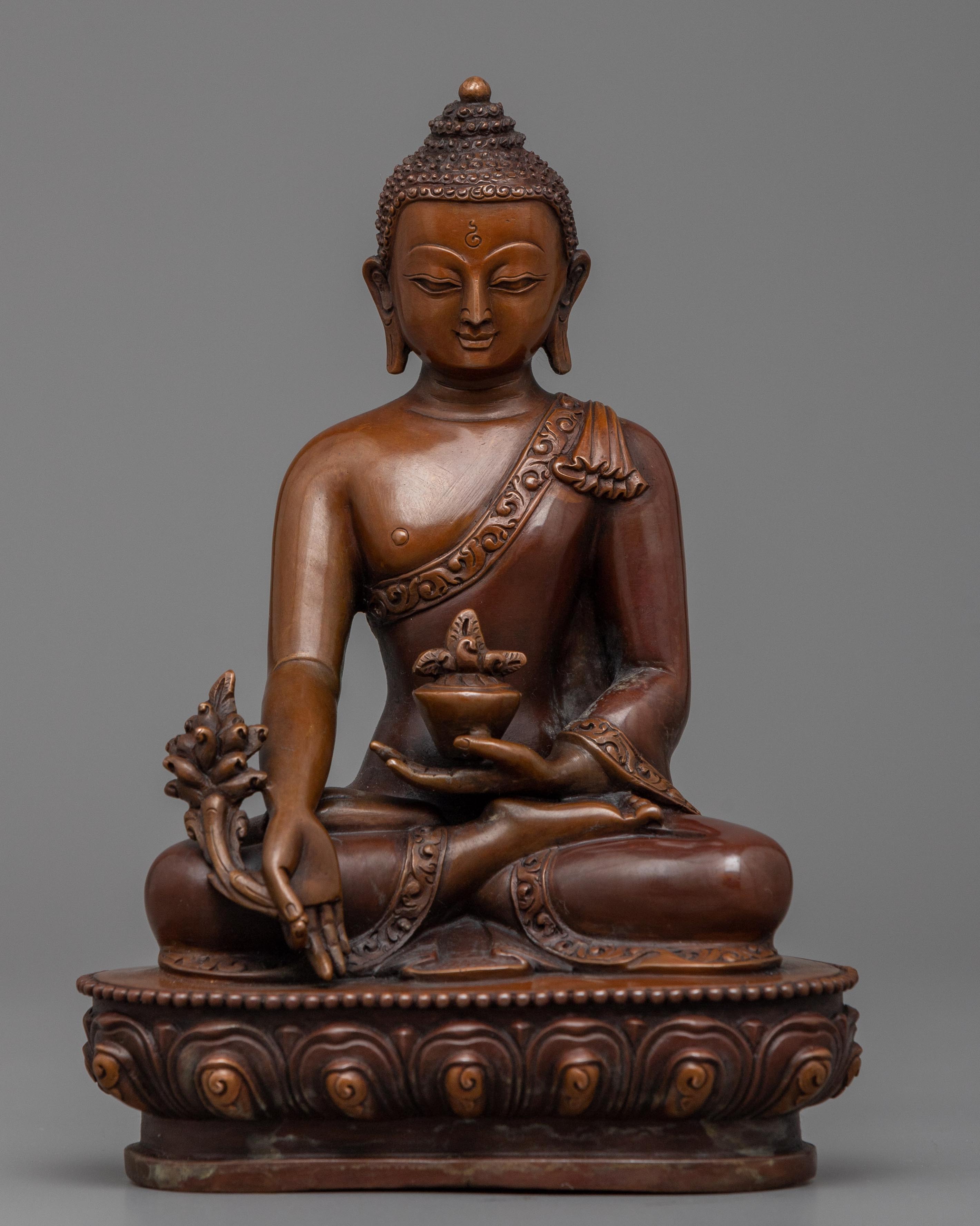 The Medicine Buddha Mantra Practice statue is an intricately handcrafted piece produced in our studio and designed with unique Nepali motifs. The figure is made of high-quality oxidized copper that gives it a classic look. Here, the Buddha is depicted sitting peacefully on a moon disc lotus seat, holding a myrobalan flower in his left hand and carrying an alms bowl containing the nectar of immortality with his right hand. Our artists use chisels and hammers to produce intricate patterns and designs throughout the statue over the course of several months.