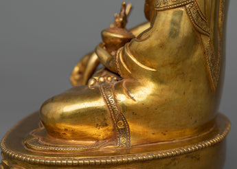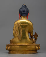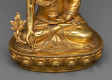 Presenting the Menla Sangay (Medicine Buddha) sculpture, a magnificent representation of compassion and healing. This sculpture, which stands at an amazing height of 11.4 inches and weighs 3.04 kg, is a monument to the enduring power of the Medicine Buddha's blessings. It is situated on a 7.8-inch base. This sculpture, which was painstakingly crafted from a copper body and embellished with 24K gold gilding and precise acrylic and gold painting, embodies the tranquil grace and heavenly promise of Menla Sangay to ease suffering and advance mental, physical, and spiritual well-being.