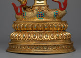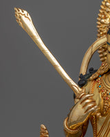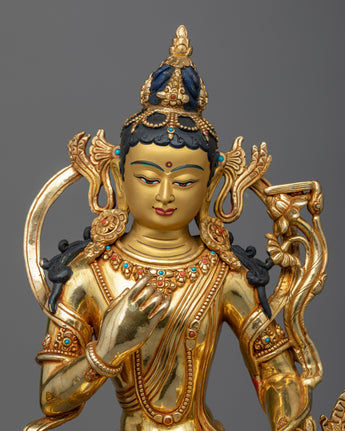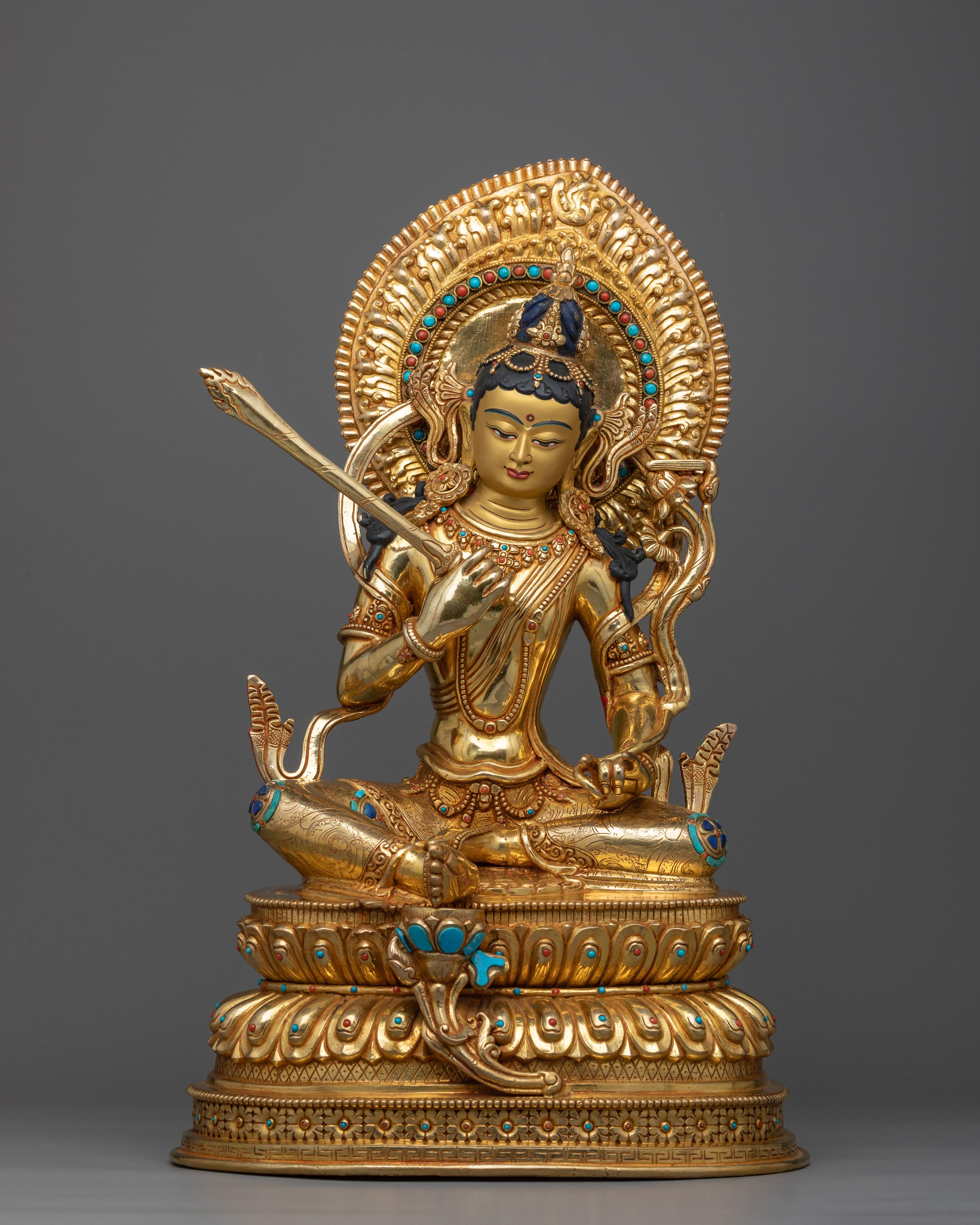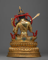 With this Manjushri "Monju Bosatsu" statue, elevate your spiritual experience. This magnificent sculpture, which stands imposingly at 16.5 inches tall, is the pinnacle of fine handicraft in Nepal. The massive 6.81-kilogram copper body is liberally decorated with 24k gold and painstakingly hand-carved gemstones. Accurate acrylic paintings that are highlighted by the bright gold gilding highlight the precisely produced design components. From the minute details to the complex decorations, every element of this monument has been meticulously made and carries the spirit of enlightenment.