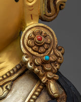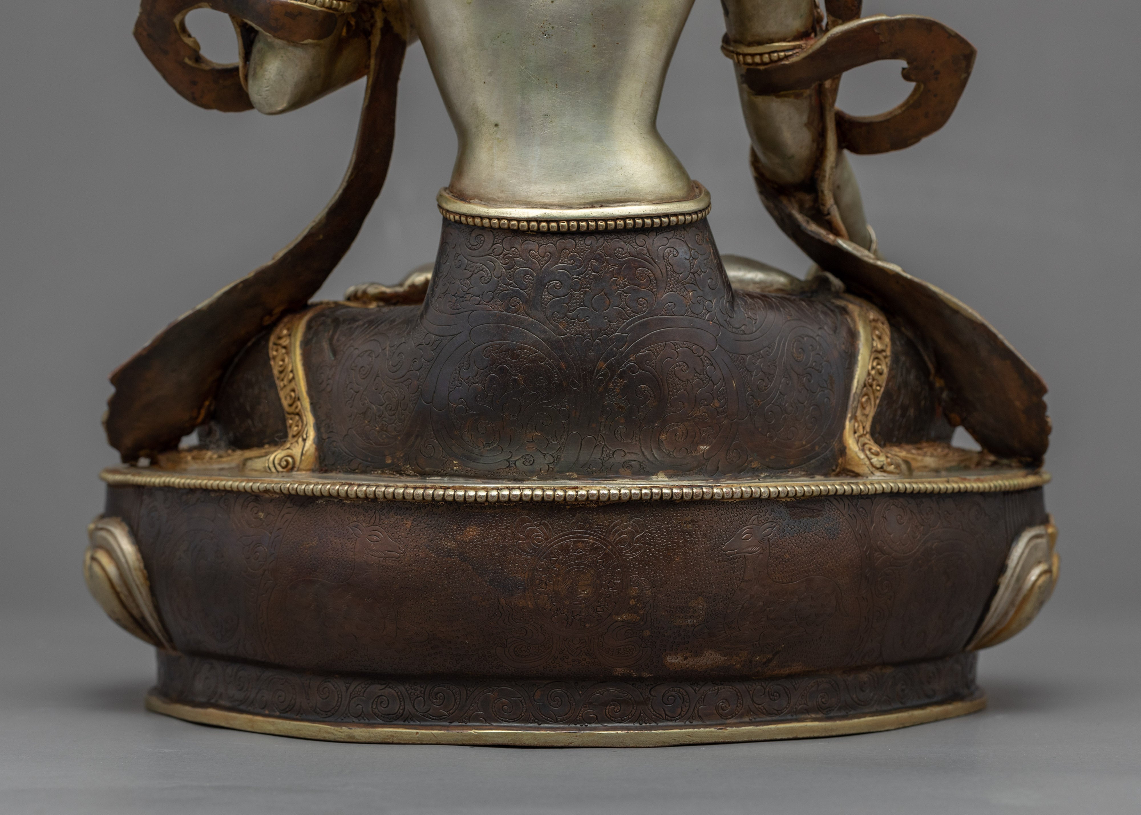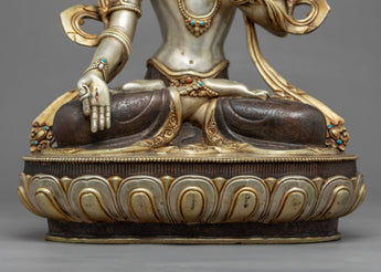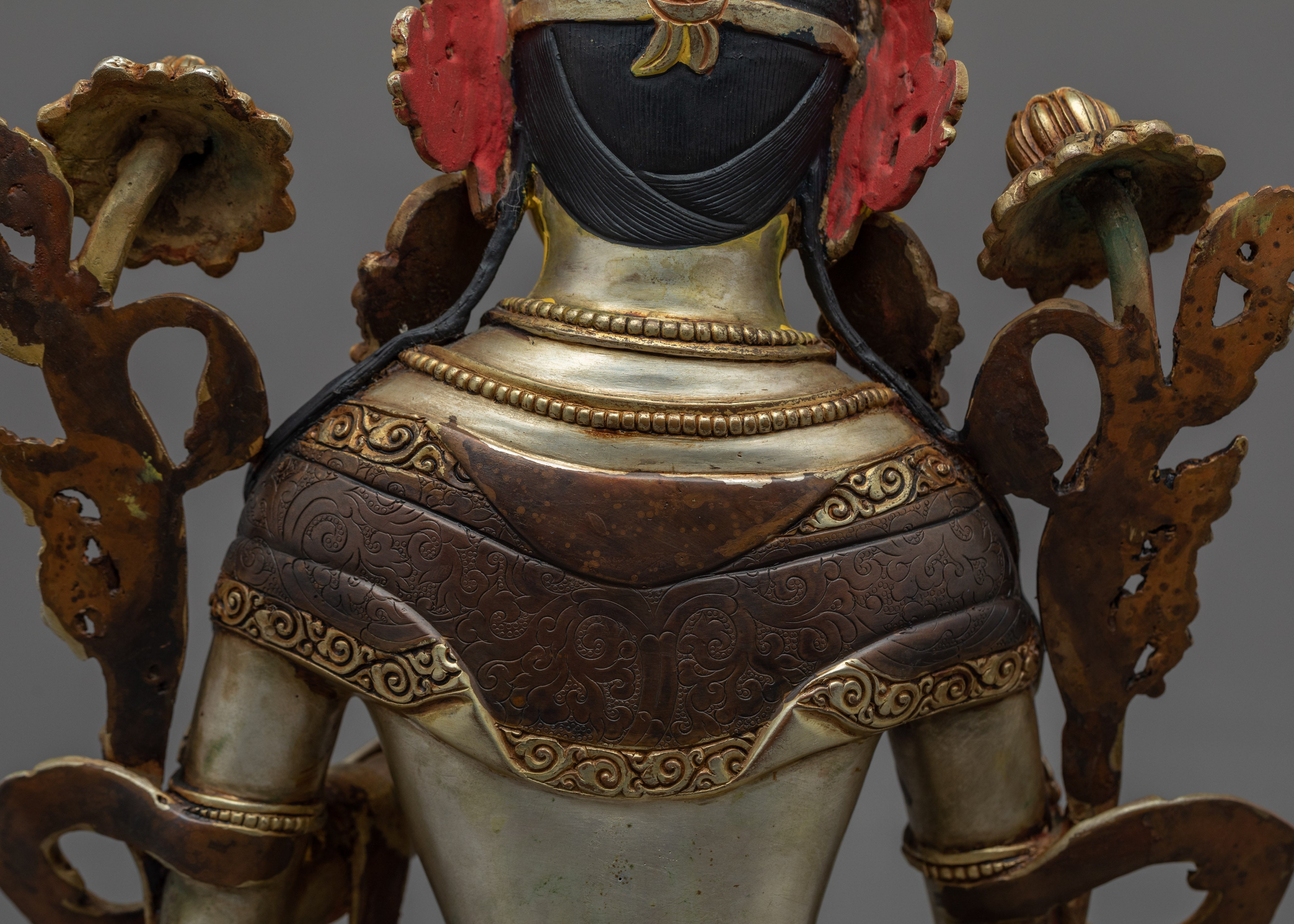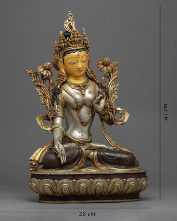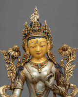 This stunning handmade Mother Tara White Goddess Statue is sculpted in our studio by master artisans. The sculpture is molded in a copper body, and the face of the deity is gilded with gold, whereas her body is plated with silver. We have depicted a deity on top of a moon disc lotus seat with a peaceful expression, holding an utpala lotus flower in both hands. This statue took months to craft with intricate design patterns.