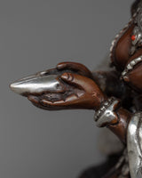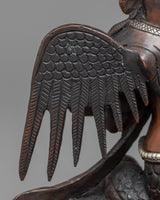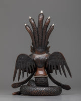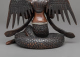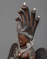 The sculpture, expertly fashioned from oxidized copper, emanates antique elegance and time-honored wisdom. The oxidized copper's deep, rich tones give the statue a magical aura, showcasing Naga Kanya's unique features, such as her serpentine lower torso and delicate patterns on her outfit.