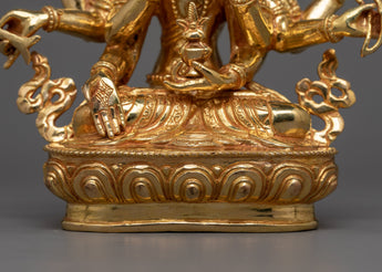 Experience the grace of our Namgyalma Figure, skillfully made by Nepali artisans in Patan. With a height of 9.3 inches and a base measuring 7.7 inches, this statue is composed of a copper body that is adorned with elaborate acrylic paints and 24K gold gilding. Buddhism regards Namgyalma as the goddess of longevity and protection; she is portrayed with a calm elegance and attention to detail.