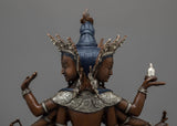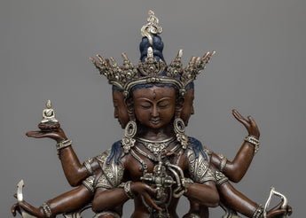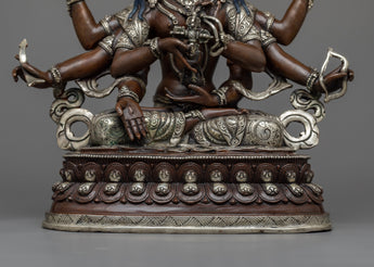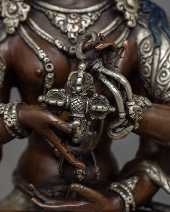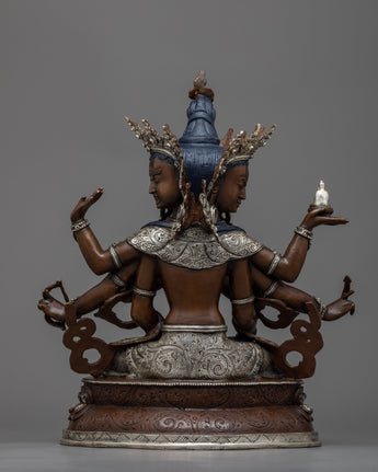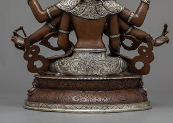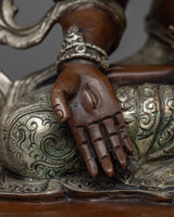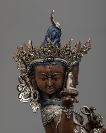 The statue captures the sublime grace of Ushnishavijaya, one of the three longevity deities, drawing on the rich legacy of Buddhist artwork. The silver-plated façade contrasts beautifully with the oxidized copper body, resulting in a symphony of durability and artistic refinement. Each curve and etch on this statue represents a journey towards awakening and long life, guaranteeing a sanctuary of calm in your home or place of meditation.
