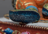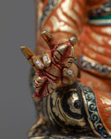 This exquisite Vajra Guru statue is a wonderful method to respect and commune with Guru Rinpoche's spirit. This statue, which is 9.8 inches tall and 6.2 inches wide at the base, is ideal for use in personal altars, meditation areas, or as a nice gift. The statue is 1.82 kg in weight and is constructed of copper that has been 24K gold-gilded. It has colorful acrylic paints and sophisticated design elements.