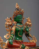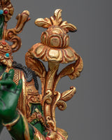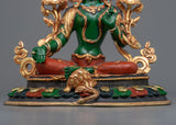 Our Green Tara and Flowers Statue, with its air of serenity and spirituality, is a work of art of meticulous design and outstanding craftsmanship. This lovely piece, made of copper and embellished with 24k gold gilding and superb acrylic paints, is a monument to the skills of Nepalese artisans.