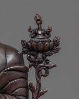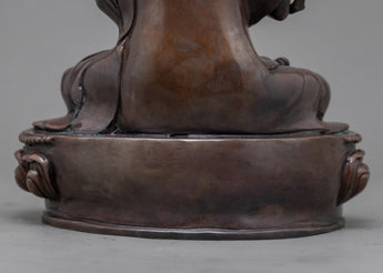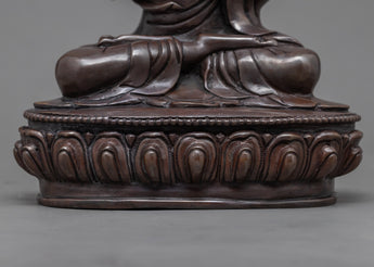 The expert artisans of Nepal created this magnificent Statue For Je Tsongkhapa Mantra Practice with a perfect design. This hand-made statue has an oxidized copper body. The deity is shown with both hands clasped over his chest and each holding a lotus stem that spreads and blossoms alongside his head, while reclining atop a lotus moon disk with a serene face. Our artist spent months finishing the intricate carvings on the statue's robes and head. The deity's minute attributes were hand-carved using a hammer and chisels.
