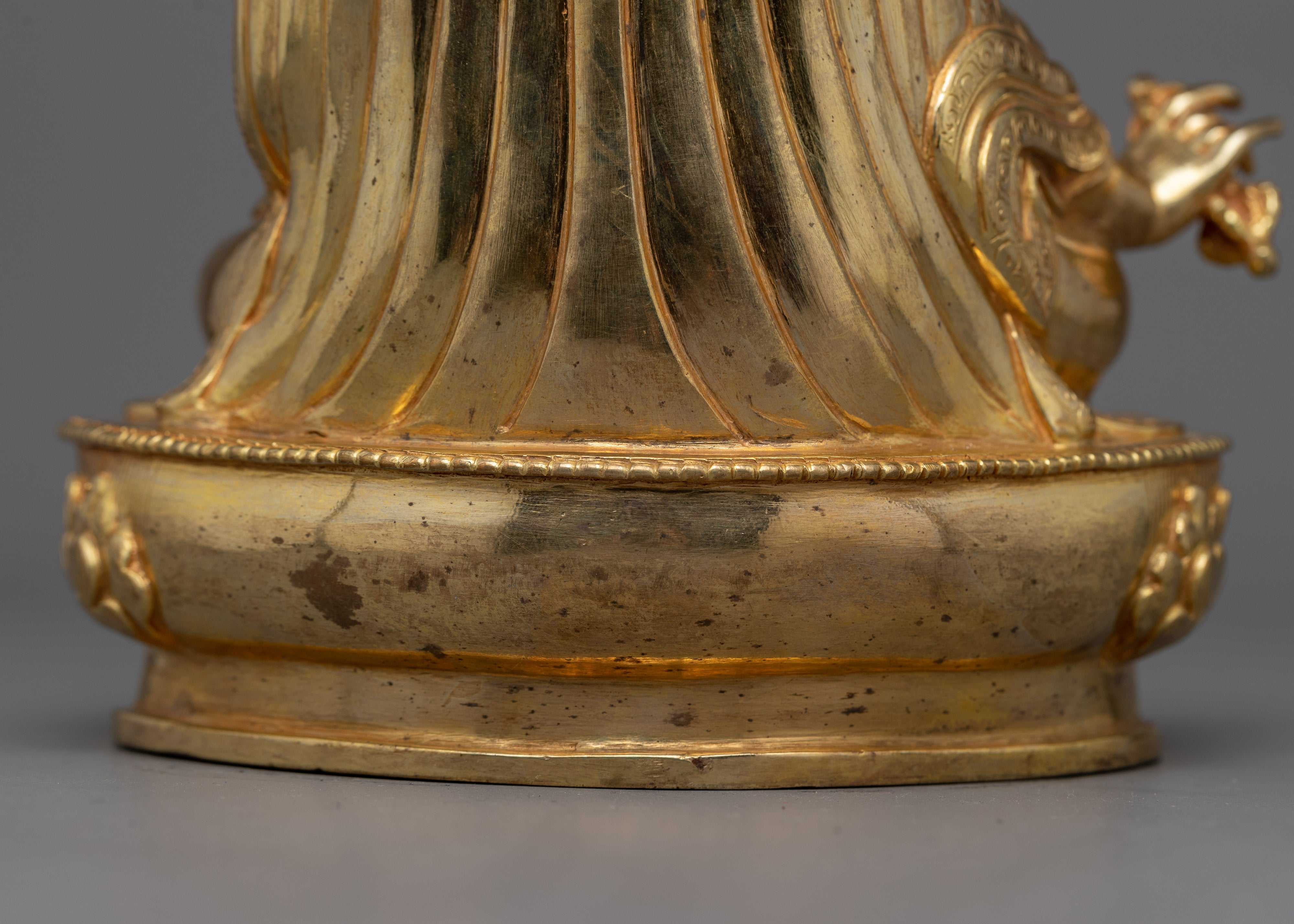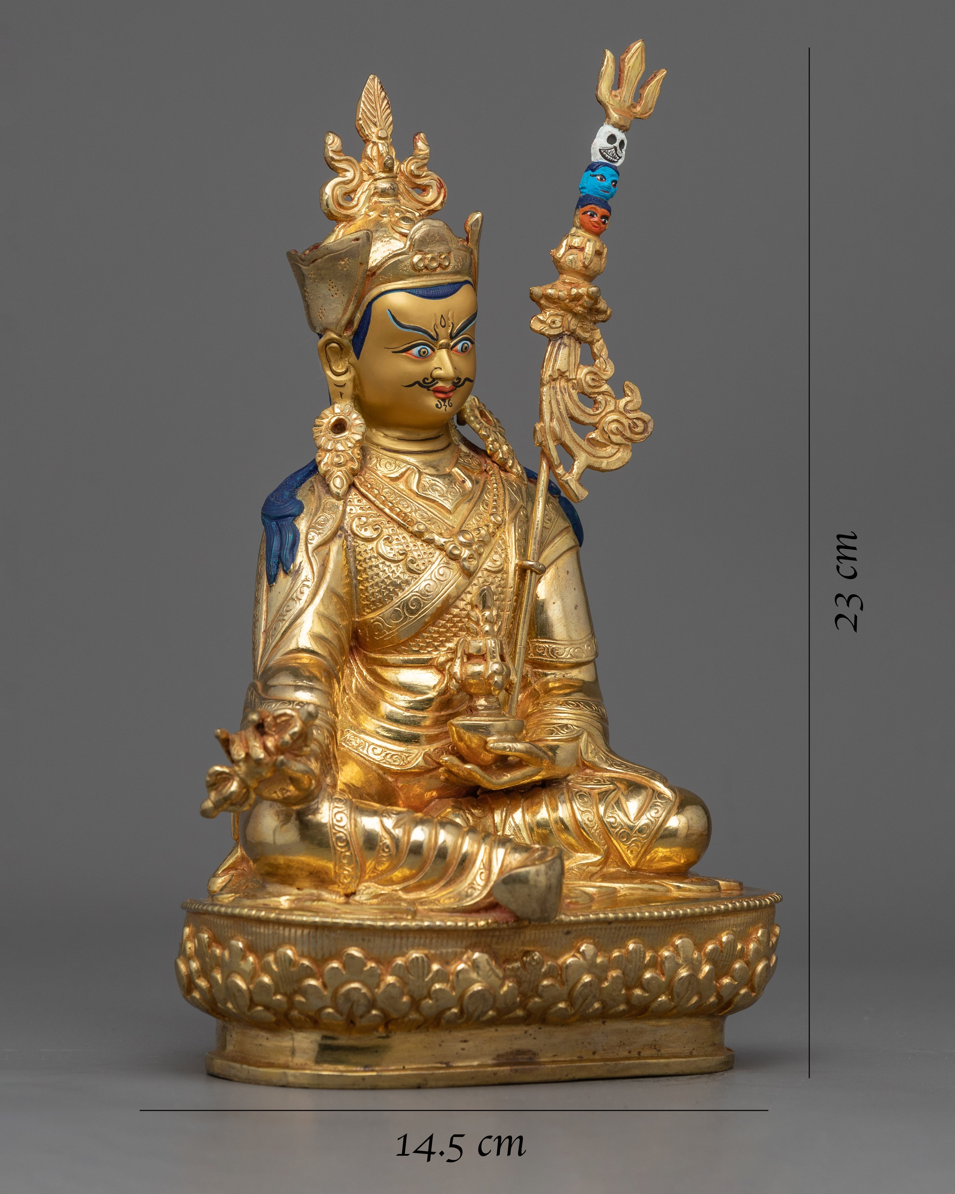 This exquisitely crafted 24k gold gilded 9-inch statue of Padmasambhava Guru Rinpoche Rupa is a lotus-born master of tantric Buddhist vajra master and makes a beautiful addition to any home or shrine. Carved with intricate details, this statue is sure to bring a sense of peace and tranquility to your space.