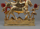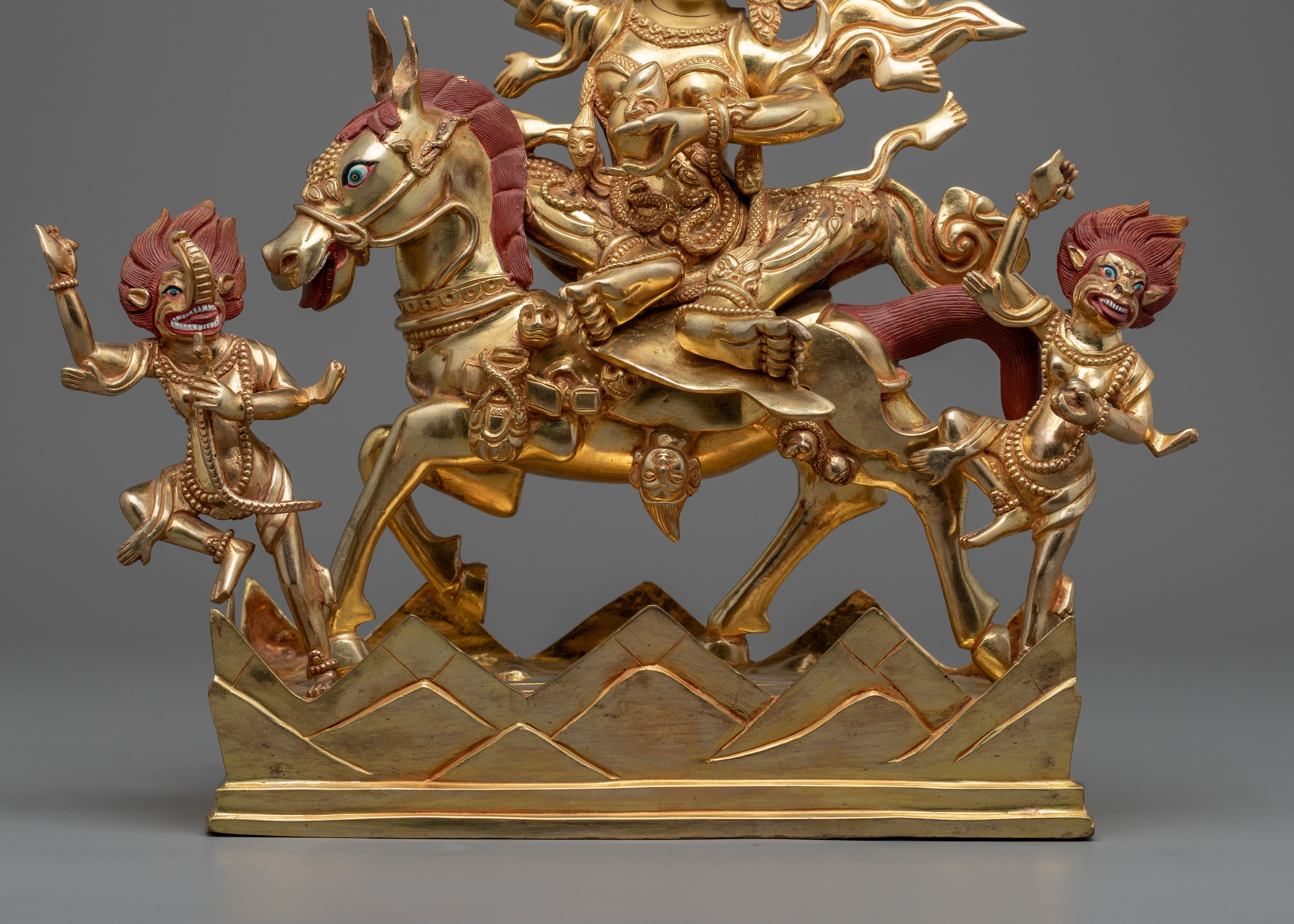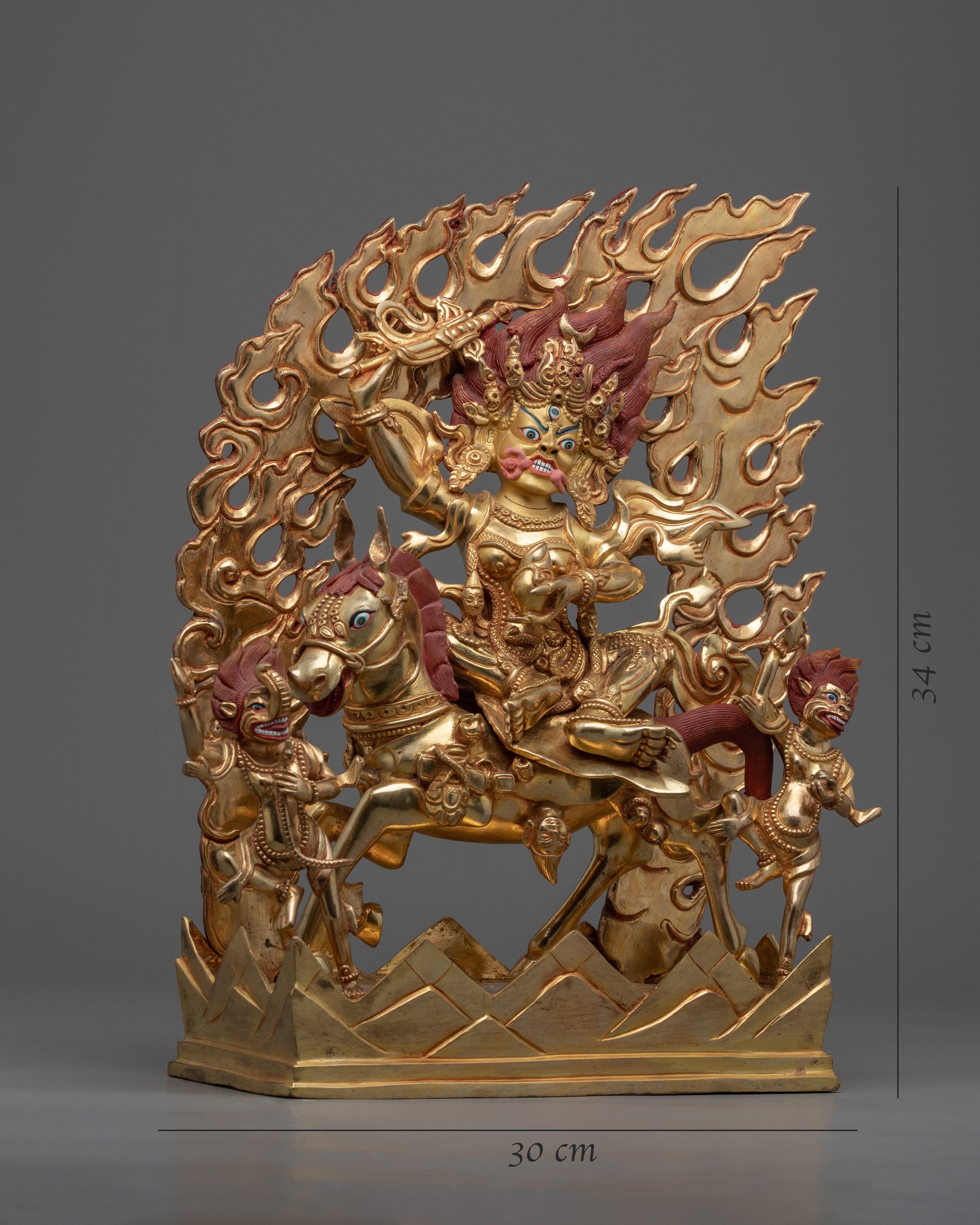 This beautifully crafted piece of Palden Lhamo statue employs traditional Himalayan motifs and designs delicately produced in our studio. The deity is depicted seated on a horse representing the swiftness with which she can come to the aid of those who call upon her. She holds a sandalwood staff with her right hand, indicating her ability to vanquish ignorance and negativity, and a skull cup with her left hand. She is surrounded by fiery flames giving prominence to her wrathful appearance.