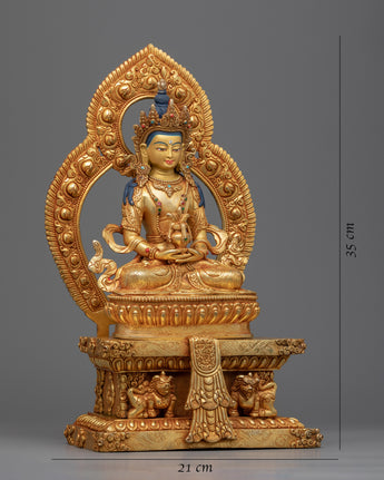 Using traditional Himalayan craftsmanship, the Statue For Amitayus Sutra Practice was artistically hand-carved in Nepal. The deity is depicted in this statue holding a vase that contains the nectar of immortality while seated on a moon disc lotus. The molding of the statue was made of copper. We carved out design patterns and used real 24K gold to gild the figure. This contains magnificent design patterns that were hand-carved. The two most noticeable aspects of the statue are its crown and throne. We have artistically positioned a nimbus behind the deity behind the throne. To achieve this, we employed a hammer and tiny chisels. Artists must have years of skill since delicate carvings require them to carve out elaborate designs on a small surface. It took us many months of arduous labor and commitment to complete Amitayus Buddha Statue.