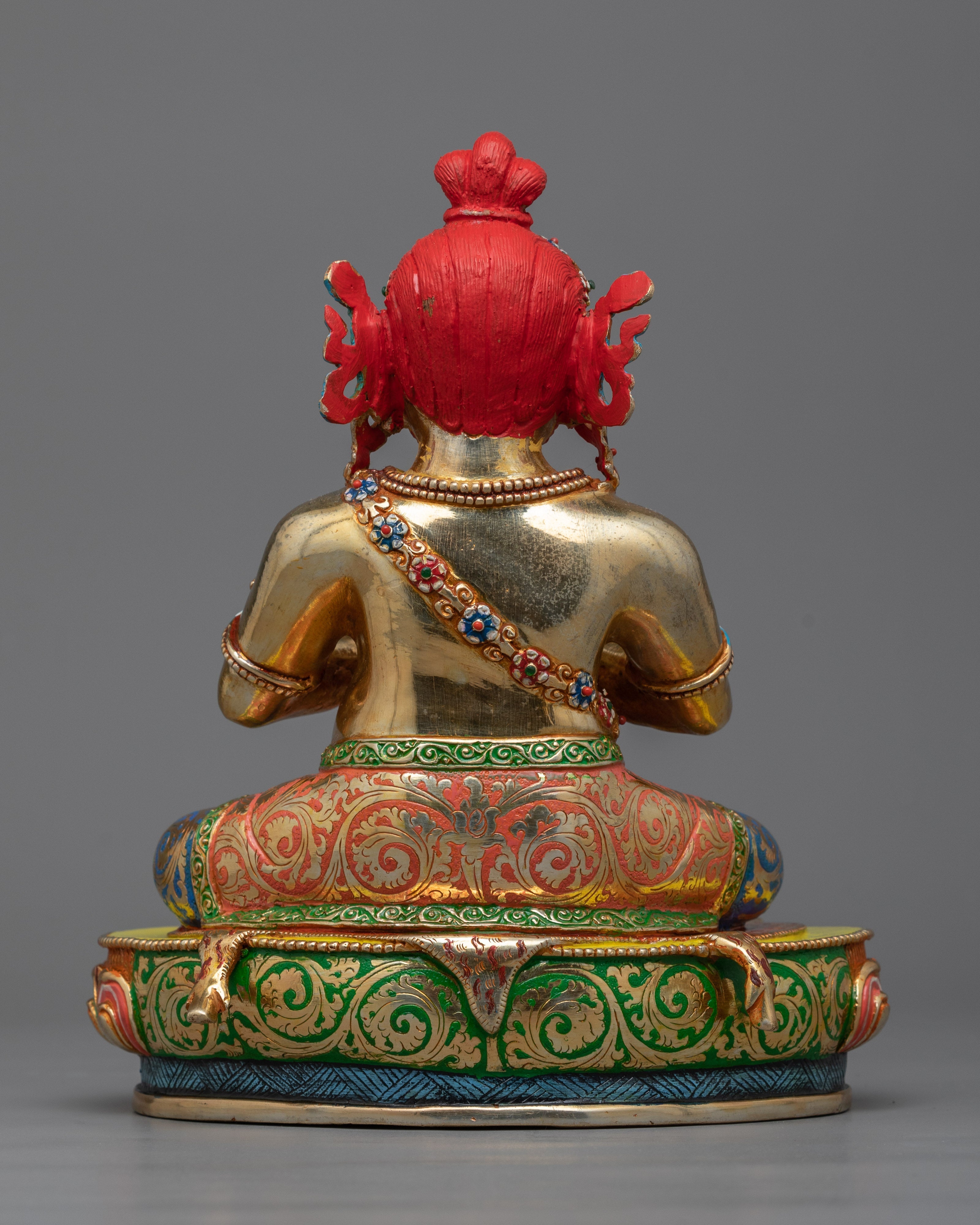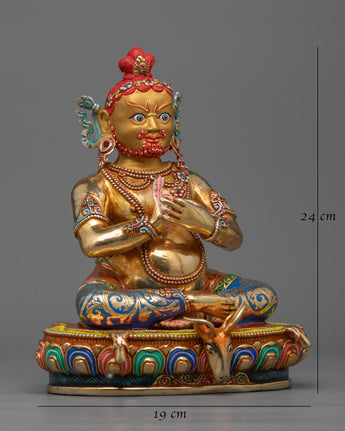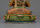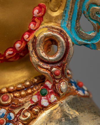 The Preaching Guru Virupa Statue is a magnificent representation of heavenly wisdom and enlightenment that will elevate your spiritual haven. This statue, which is made with unmatched artistry, is 9.4"/24 cm tall, 2.43 kg in weight, and has a copper body along with elaborate embellishments like 24K gold plating and gold and acrylic paintings with vivid red, blue, and gold tones. Invoke deep peace and spiritual liberation when Guru Virupa is in your sacred space. He will also motivate you to live a life full of wisdom and enlightenment by immersing you in the transcendent energy of Virupa and the teachings of compassion and wisdom that he embodies. Allow his kind nature to shroud you in tranquility and inner calm as he leads you to a more profound comprehension of the essence of life.