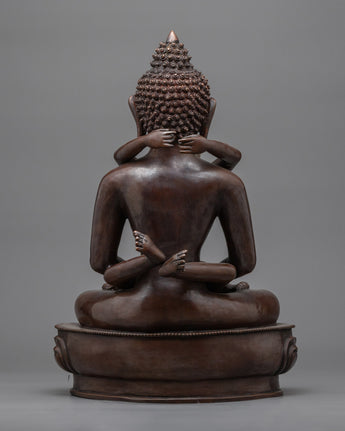 The Primal Buddha Samantabhadra with Consort Statue embodies the essence of primordial wisdom. Standing 16.1 inches tall and weighing 7.90 kg, this oxidized copper figure represents the underlying nature of existence as understood in Vajrayana Buddhism. Samantabhadra, the primordial Buddha, is described in perfect union with his wife, meaning the inseparable nature of knowledge and emptiness, masculine and female principles, and the ultimate non-duality.