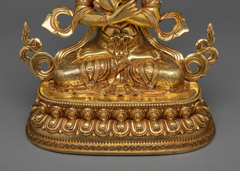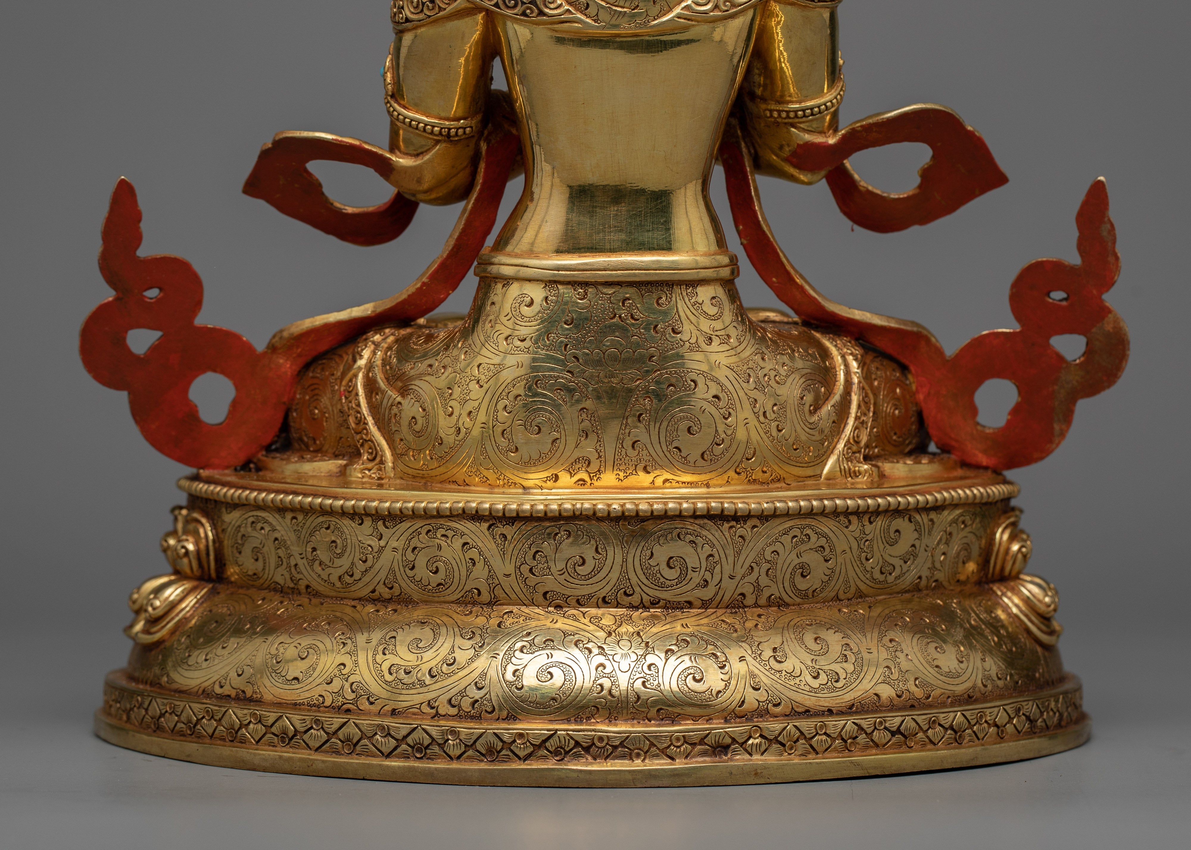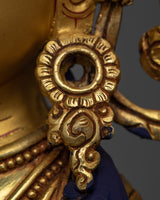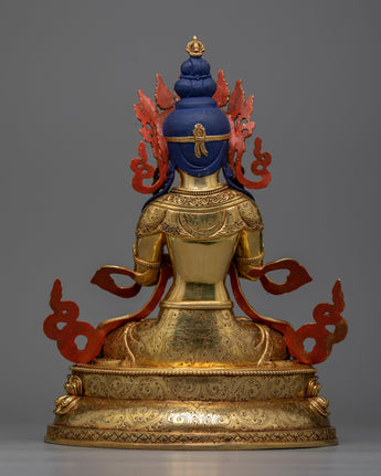 The sculpture is expertly made with a copper body for longevity and traditional aesthetic appeal. It is embellished with a beautiful 24K gold gilding, adding spiritual meaning and a bright finish representing Vajradhara's purity and enlightened state. The detailed gold and acrylic paintings further enrich the statue, highlighting the intricate features of Vajradhara’s serene form and regal adornments.