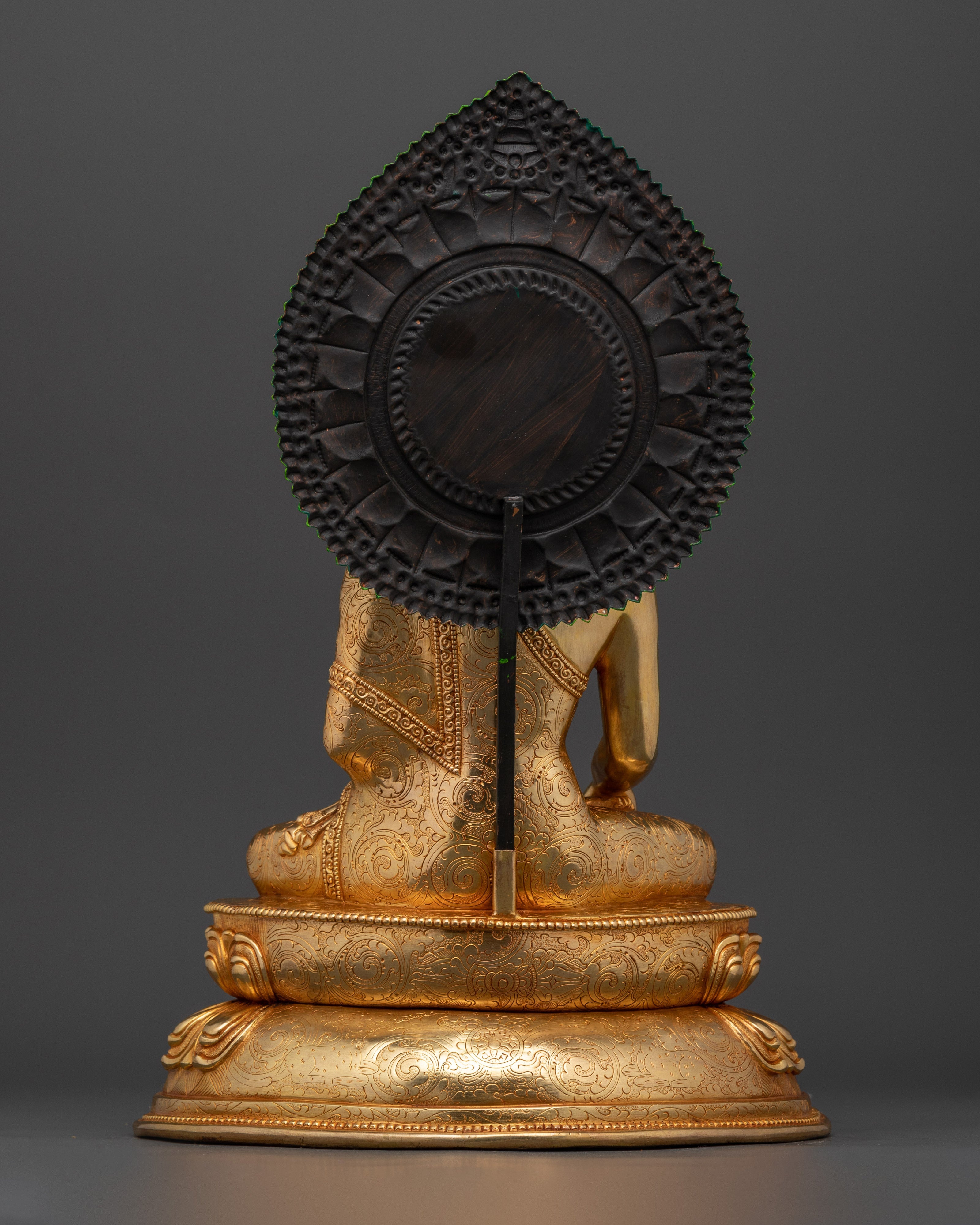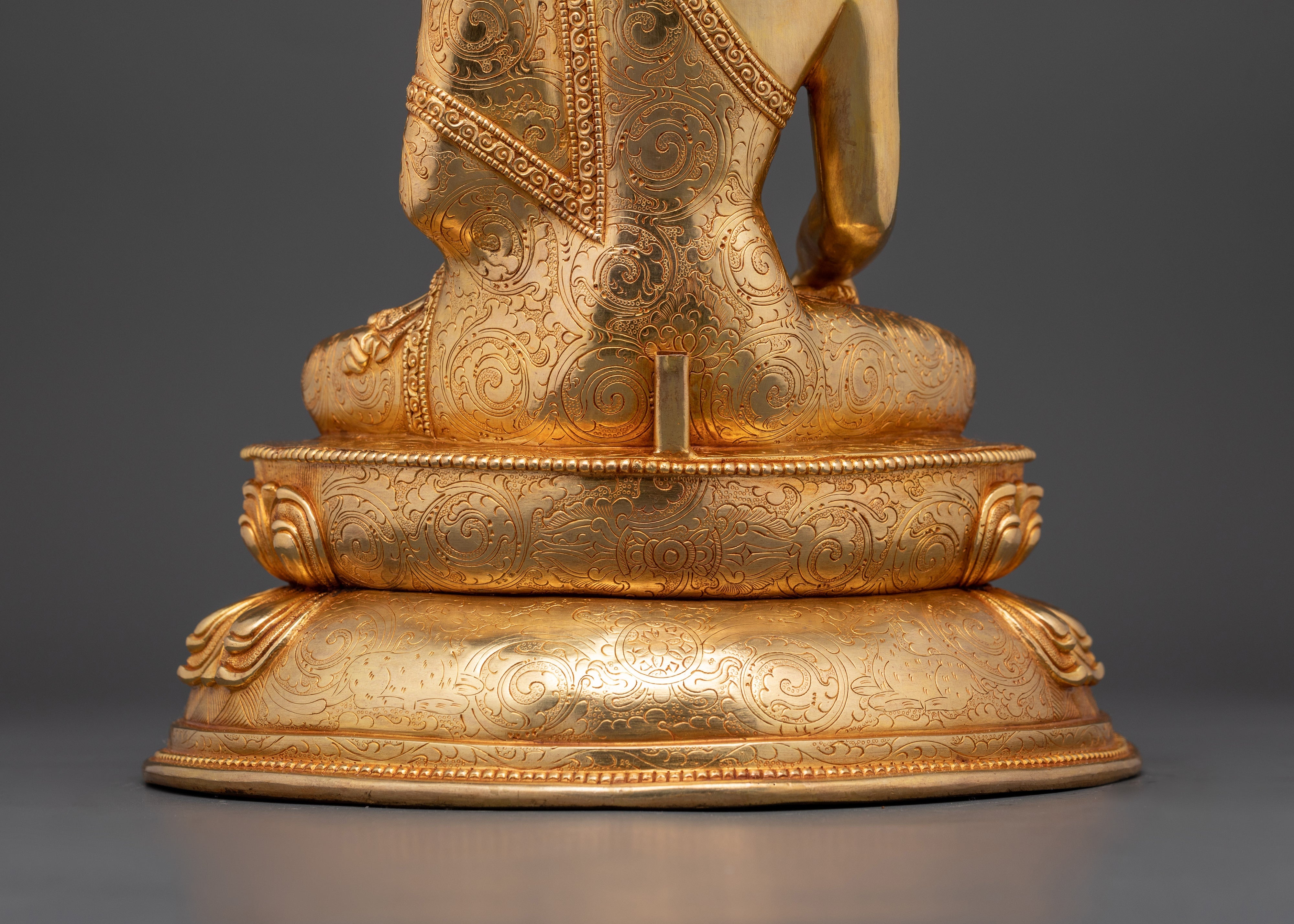 The sculpture represents Buddha with his right hand resting on his knee and his fingers touching the earth, representing the Earth-touching mudra. His left-hand rests comfortably on his lap, holding an alms bowl. This pose represents enlightenment, anchoring, and the Buddha's connection with the earth and his disciples.