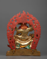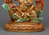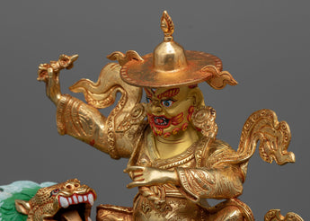 Introducing the Protector Dorje Legpa statue, a symbol of power and spiritual protection. This statue, elegantly coated in bright 24k gold and embellished with beautiful acrylic paintings, inspires a sense of powerful protection while remaining loyal to Dorje Legpa's essence. Its sturdy copper body, shimmering with a golden halo, is proof of high craftsmanship and devotion to spiritual protection.