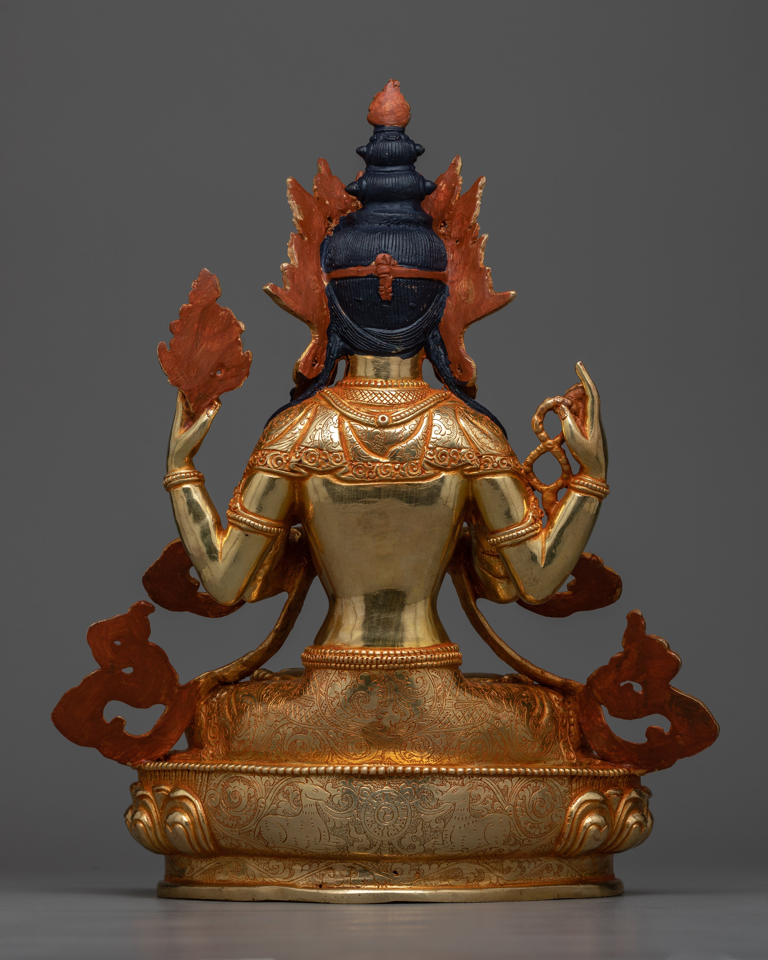 The artistry of this sculpture is evident in every aspect, from Chenresi's tranquil countenance to the elaborate patterns covering his clothes. The statue's presence in your space promises to be more than simply a decorative feature; it represents inner serenity and serves as a reminder of the journey to enlightenment. It's an ideal piece for those who appreciate the depth of Buddhist iconography or seek a focal point for meditation and reflection in their home.
