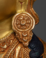 Discover the tranquil beauty of our Chenresi Sculpture, which beautifully expresses the essence of compassion and empathy in the Buddhist tradition. This statue is meticulously created, with a copper body that is both sturdy and elegantly shaped. The 24K gold gilding gives a touch of opulence, blending beautifully with the delicate gold and acrylic paintings to produce visually striking artwork.