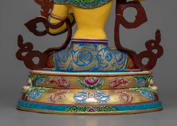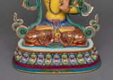 Manjushri's loving and dynamic spirit is brought to life via vivid acrylic colors, drawing attention to the delicate features of his shape and the wisdom symbols he carries. The copper body of the sculpture ensures durability and adds a timeless quality, while the colors invite a contemporary vibrancy that resonates with practitioners and admirers alike.
