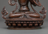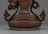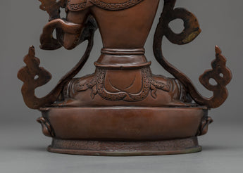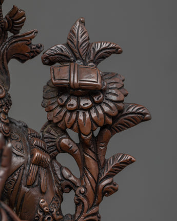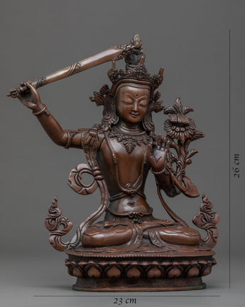 This Rare Manjushri statue was crafted by the master craftsmen of Nepal with traditional Vajra techniques in our studio in Kathmandu. This figure was Handcrafted using an Oxidized Copper body with flawless intricate design patterns which highlight the iconography of the deity. The statue shows the figure sitting on a moon disc lotus with a calm expression and holding the sword of knowledge in her right hand over her head. The left hand is holding a lotus stem that rises and flowers above her shoulder which holds the book of wisdom on its petals.