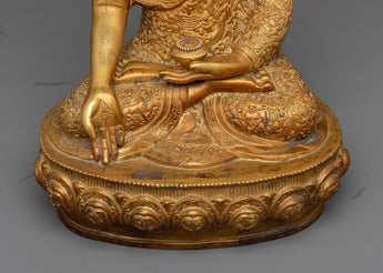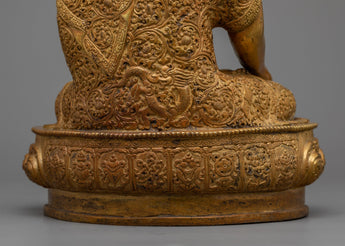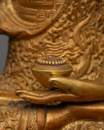 Ratnasambhava's statue is composed of copper alloy and 24k gold-gilded. Ratnasambhava is shown seated on a moon disc lotus seat, his right hand in the gesture of generosity, 'Varada mudra,' and his left hand carrying an alms bowl.
