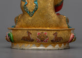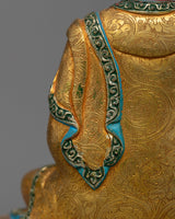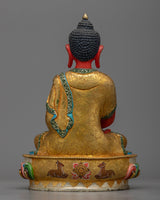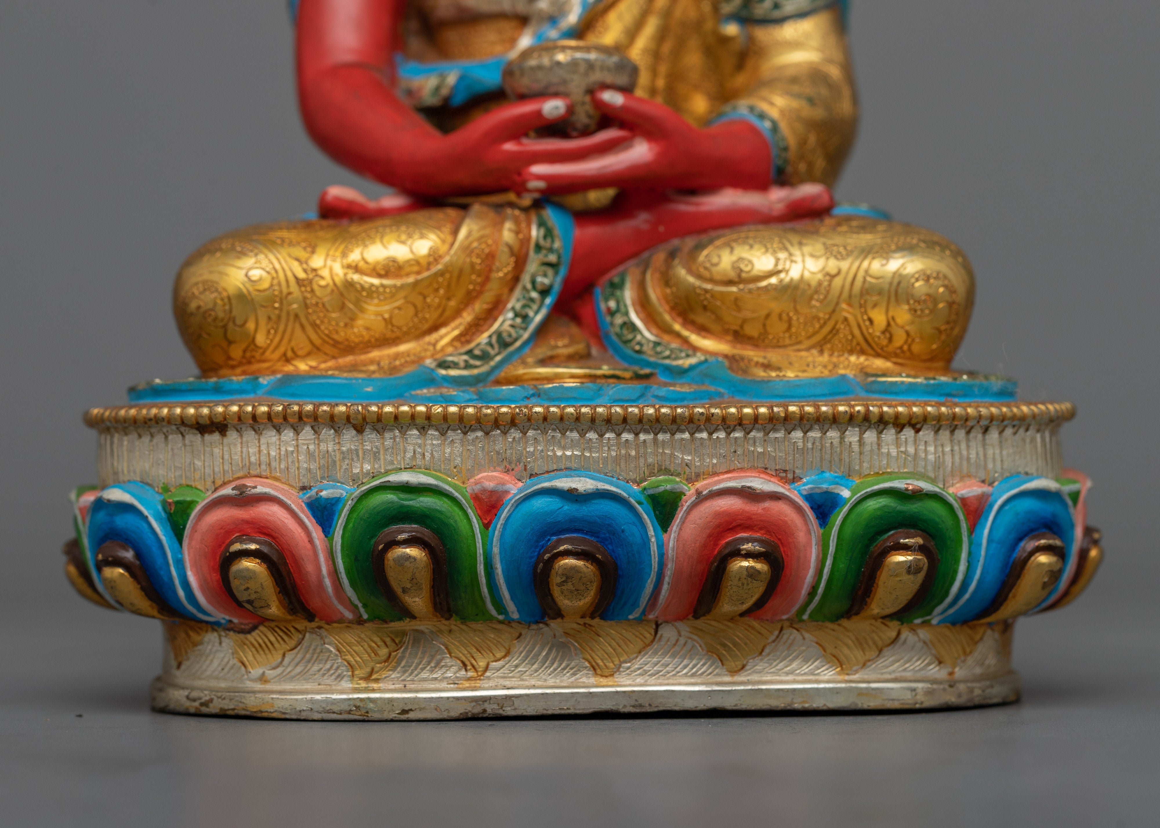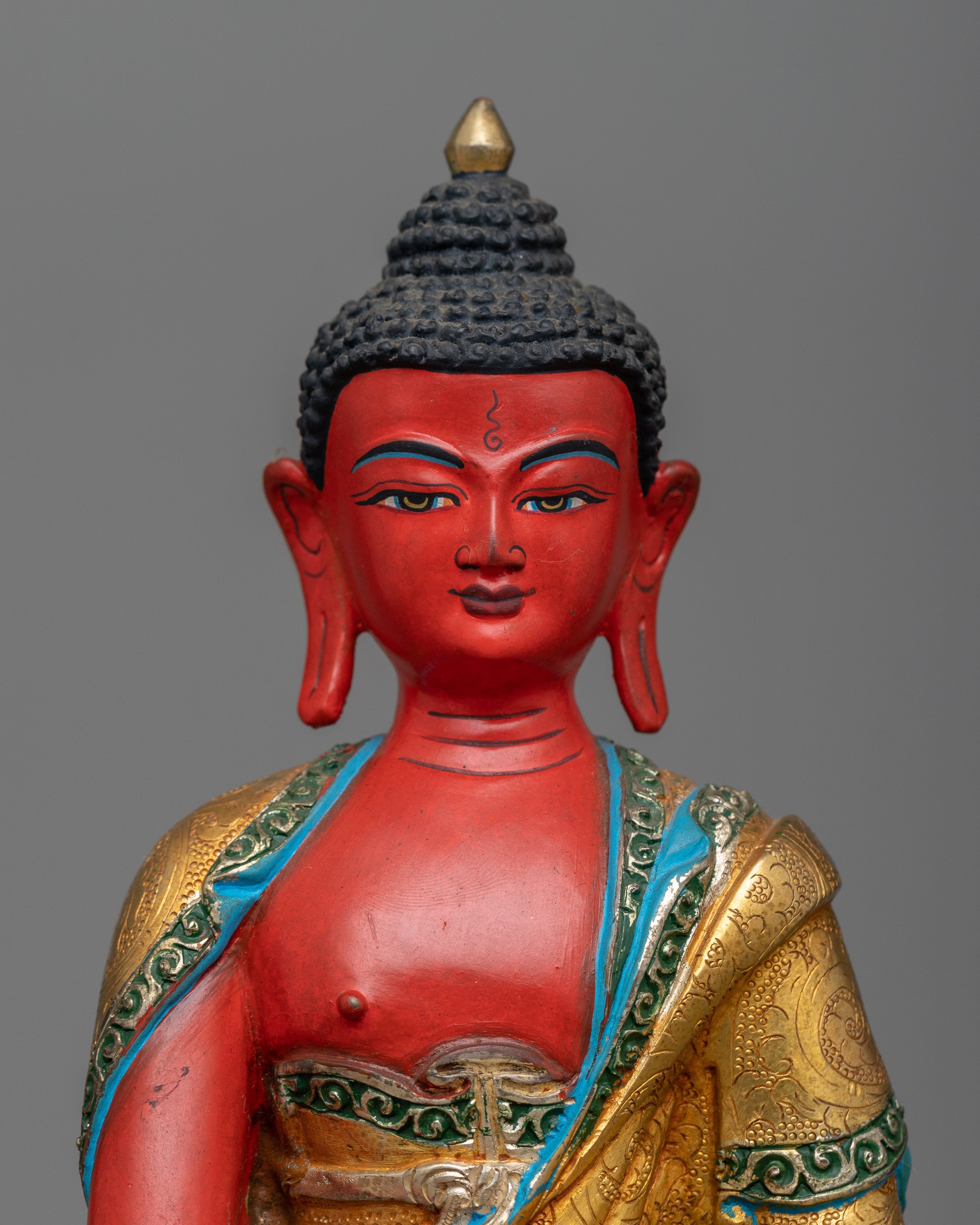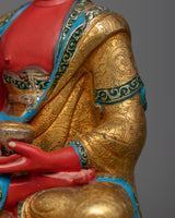This beautiful sculpture depicts the Red Amitabha Buddha's profound tranquility and infinite compassion. This artwork, standing 8.6 inches tall and weighing 1.52 kg, elegantly depicts Amitabha Buddha, the primary Buddha of Pure Land Buddhism, who is recognized for his promise of salvation and the establishment of the Western Pure Land of Ultimate Bliss. This sculpture, made of copper and embellished with 24K gold gilding, stands out for its brilliant red coloring on the body, which represents Amitabha's limitless light and warmth. The garments are painstakingly gilded, lending a regal quality that matches the Buddha's compassionate presence.
