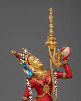Our Red Painted Naro Dakini Statue, a remarkable expression of spiritual dynamism and artistic quality, is now available. This 14.9-inch-tall statue is a colorful representation of the Naro Dakini, an important character in the Tibetan Buddhist tradition. This magnificent sculpture is made of solid copper and has a dazzling 24K gold electroplated finish that complements the vibrant red and acrylic colors. The Dakini's form is highlighted by the combination of gold electroplating and colorful decoration, from the beautiful lines of her posture to the expressive details of her dress and accessories.