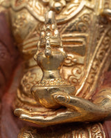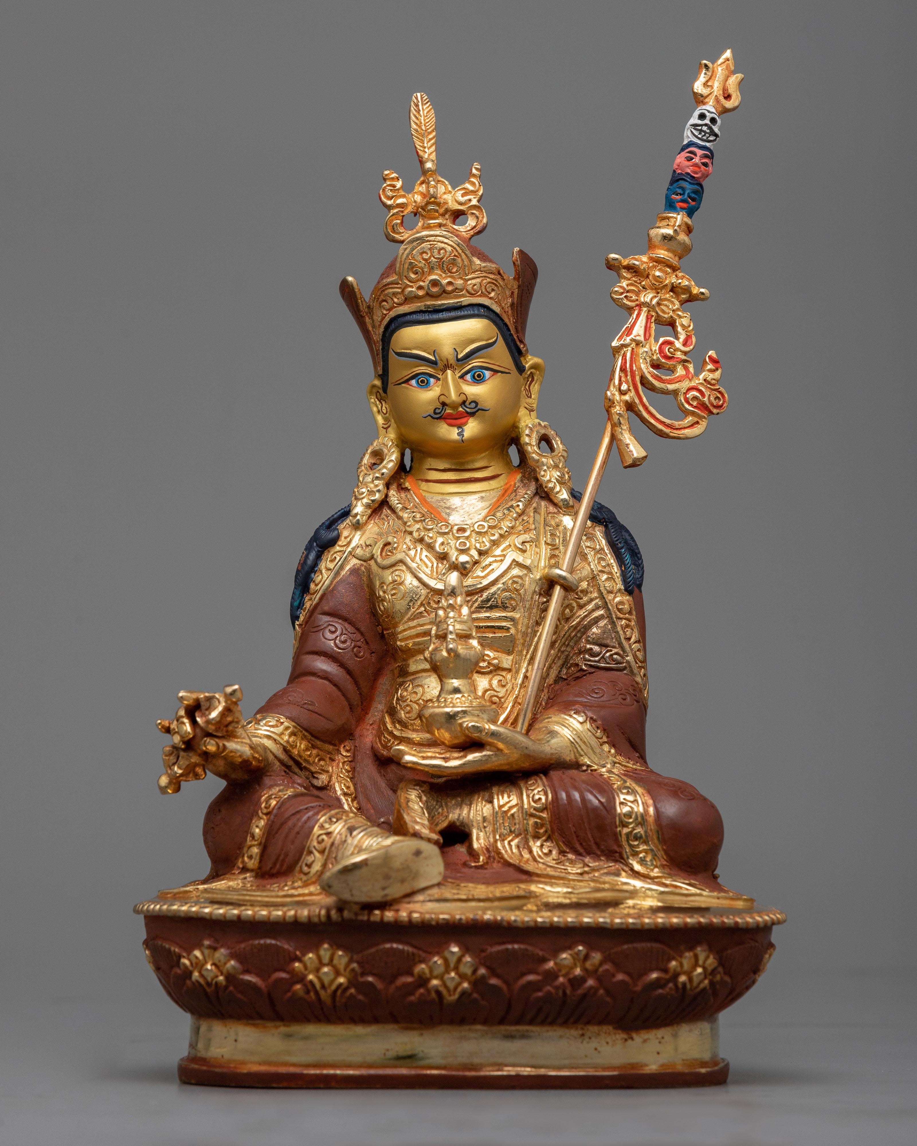 Introducing the Sacred Guru Rinpoche Sculpture, a profound depiction of the beloved saint Padmasambhava also referred to as Guru Rinpoche, who was instrumental in bringing Vajrayana Buddhism to Tibet. This sculpture, which stands at a harmonic height of 9 inches on a base of 5.5 inches and weighs 1.13 kg, perfectly conveys the enlightened knowledge and spiritual splendor of Guru Rinpoche. This item, made of an oxidized copper body for an aged and venerable appearance, is embellished with intricate paintings in gold and acrylic and is gilded with 24K gold. It represents the breadth of Guru Rinpoche's teachings and his continuing influence on practitioners' hearts.