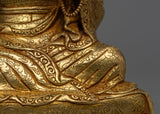 Introducing the Sacred Karmapa Statue, a dignified depiction of the Tibetan Buddhist Karma Kagyu tradition's venerated spiritual head, the Karmapa. This magnificent statue weighs 0.970 kg and measures 7.1 inches in height while sitting on a 4.7-inch base. Painstakingly painted in gold and acrylic, with a copper body embellished with 24K gold gilding, it embodies the spirit of the Karmapa's enlightened presence and his function as a lighthouse of spiritual enlightenment, knowledge, and compassion.