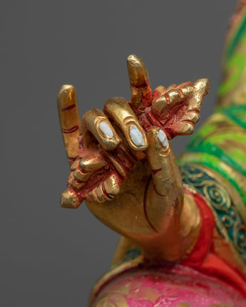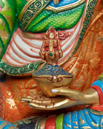 This monument is a beautiful blend of spiritual importance and artistic brilliance, handcrafted with exquisite precision. Its dazzling copper body, embellished with layers of 24k gold gilding and enhanced with vibrant acrylic paintings, invites you to explore the world of spirituality and meditation further. Each component of the statue works in unison to become an embodiment of wisdom, compassion, and transcendence.