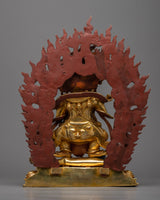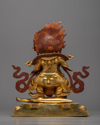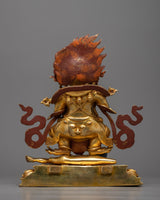 Introducing the Sakya Dharmapala Statue, an imposing portrayal of the Buddhist protector god that stands 14.5 inches tall. This 6.22 kg statue depicts the imposing figure of Sakya Mahakala, a protector of the Dharma who is honored for his role in protecting Buddhist teachings and practitioners. The statue's copper body shines with 24K gold plating and is adorned with careful gold and acrylic paints, which add to its divine atmosphere and deep meaning.