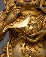 The statue's 24K gold gilding represents Sakya Dharmapala's holiness and celestial power, while the gold and acrylic paintings depict his furious look and warrior outfit. This depiction symbolizes the deity's unwavering commitment to safeguarding the Dharma against obstacles and adversaries. His posture and the weapons he wields represent his readiness to combat negative forces, ensuring the preservation and propagation of Buddhist teachings.