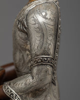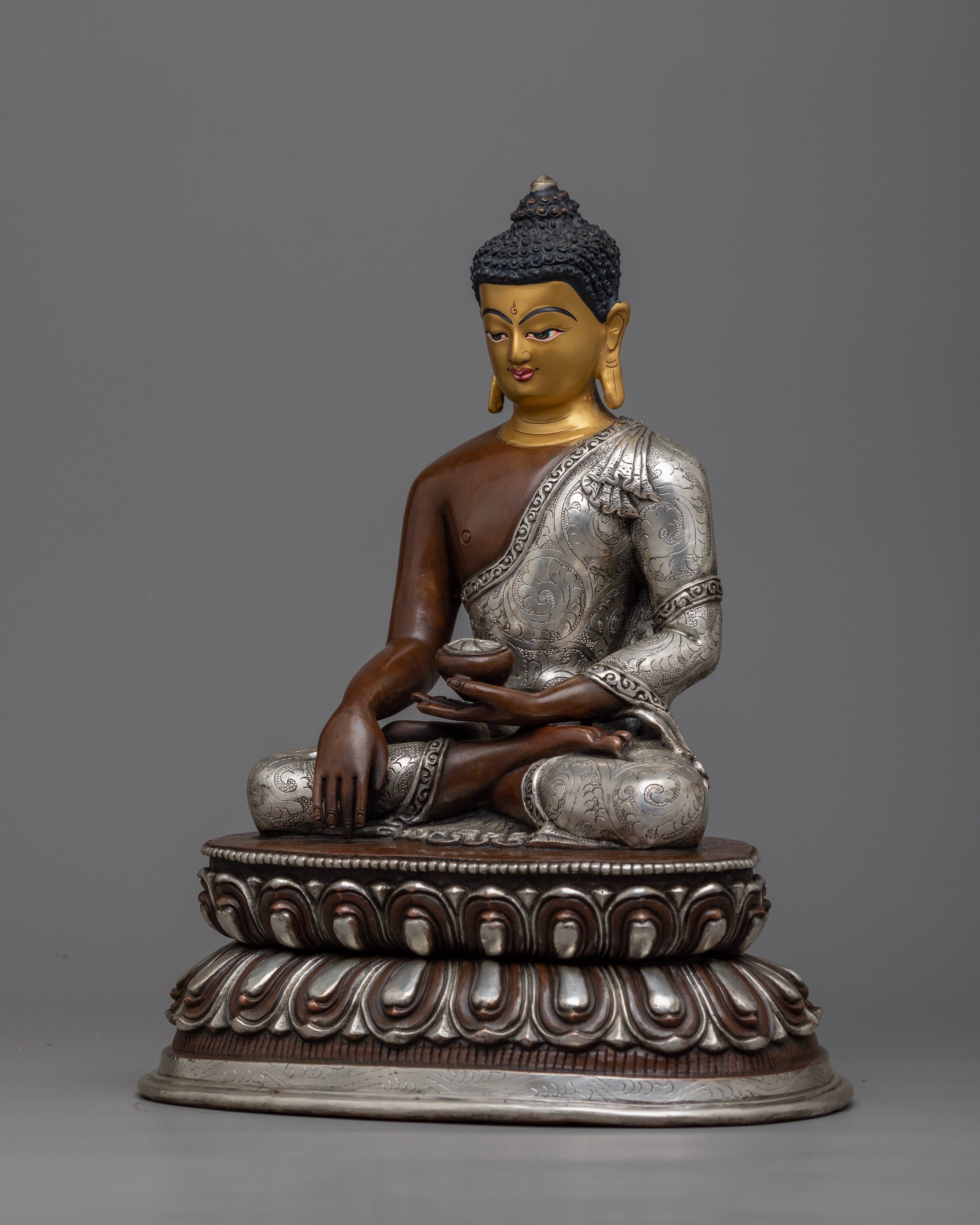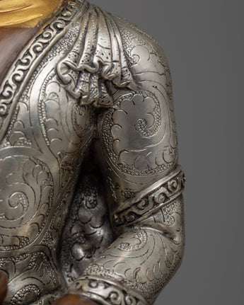 This painstakingly crafted statue honors Sakyamuni Buddha's profound teachings and the transformational power of his enlightened presence. Its eternal beauty and symbolic importance make it an essential asset to any spiritual or meditative setting. This statue was handcrafted with the finest care and attention to detail, and it includes 24k gold and acrylic paintings, silver plating, and an oxidized copper body. The meticulous craftsmanship and materials used result in a stunning work of art that oozes elegance and reverence.