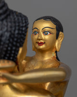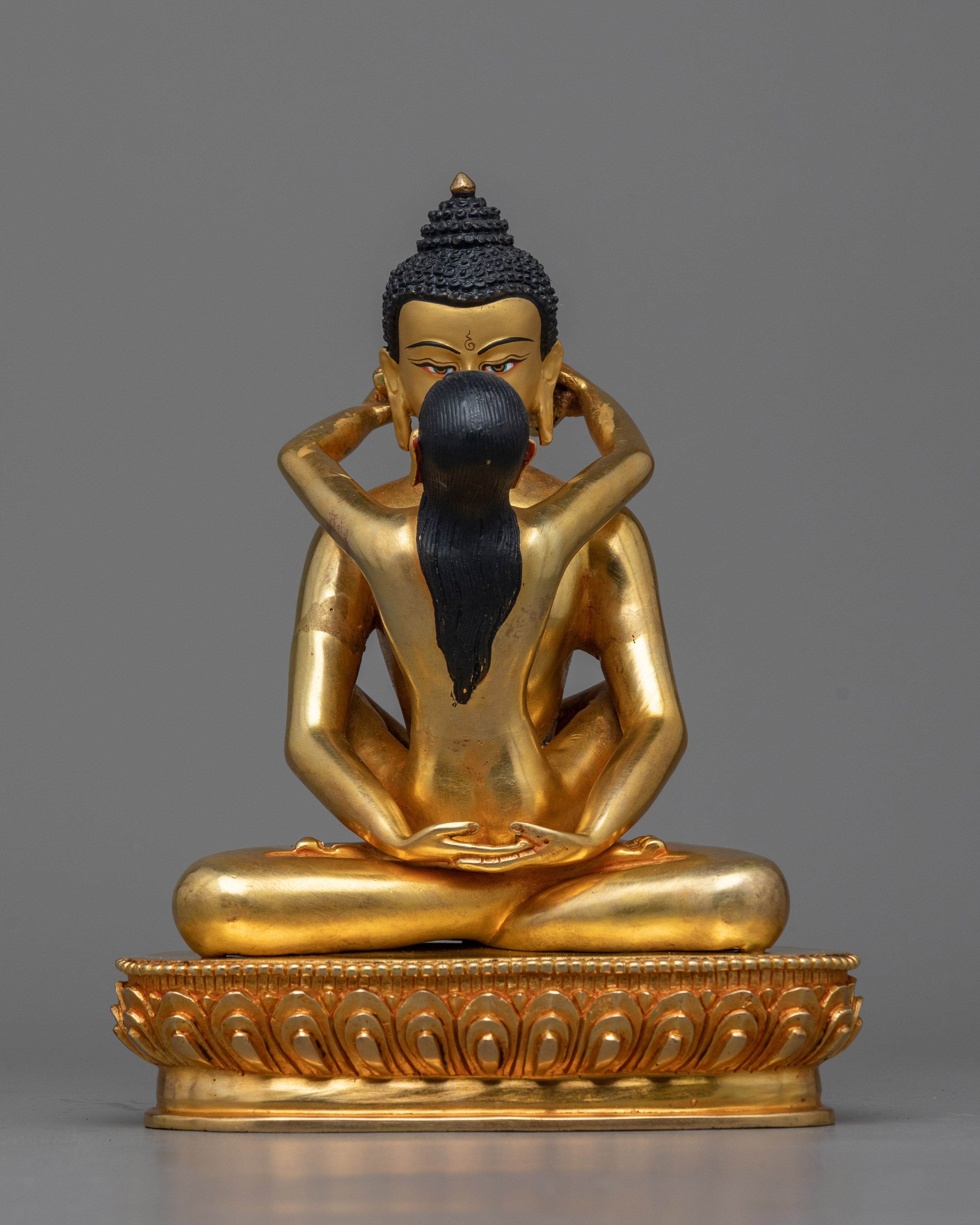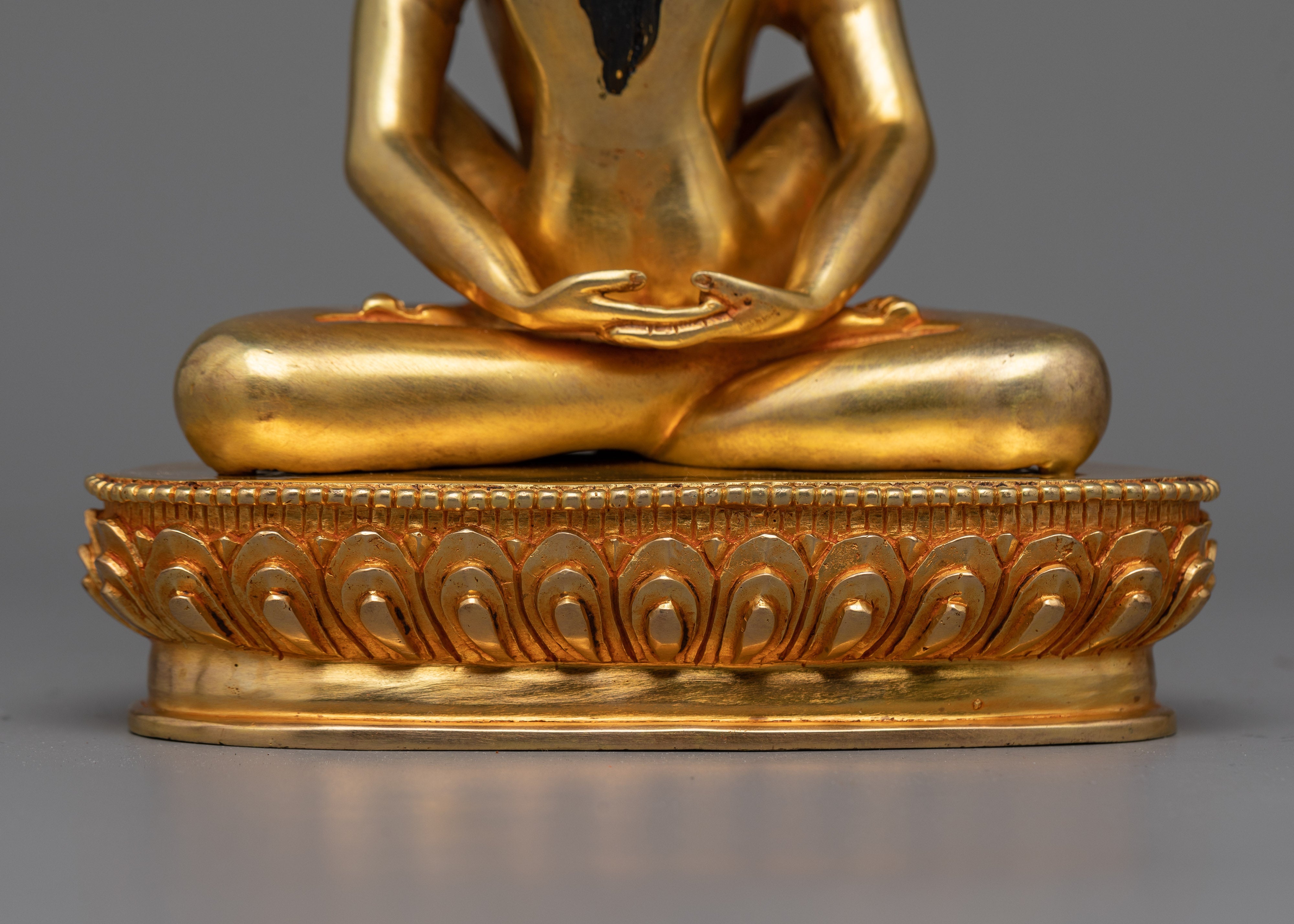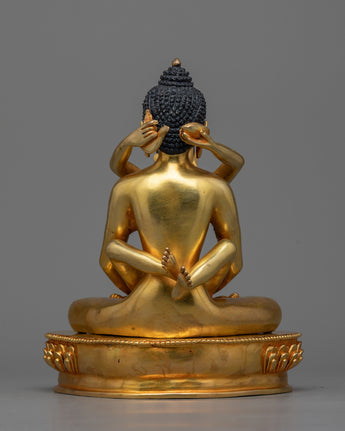 Introducing the sculpture of Samantabhadra, the Bodhisattva of Universal Virtue, in union with his spouse. This image represents the perfect fusion of wisdom and compassion, two necessary qualities for enlightenment. This sculpture, which is 2.27 kg in weight and is 8.7 inches in height by 6.7 inches in breadth, is a tribute to the profound unity and well-balanced spirituality that Samantabhadra embodies. The piece, made of a copper body gilded in 24K gold and embellished with gold and acrylic paintings, perfectly conveys this holy pair's luminous serenity and profound spirituality.