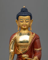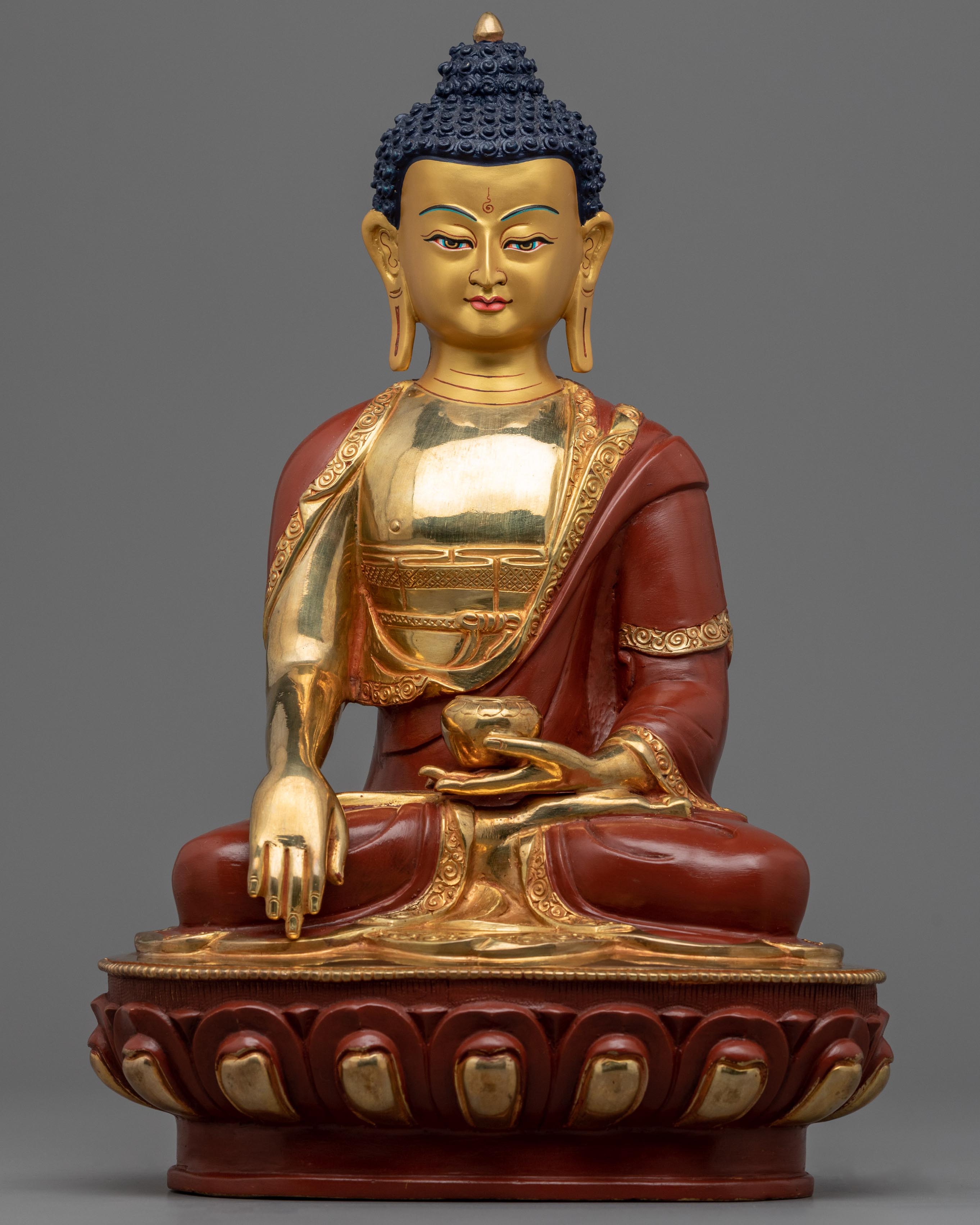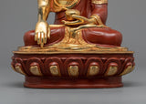 With their years of training and experience, our artisans have produced yet another magnificent statue for the Namo Shakyamuni Buddha Mantra. Pure copper makes up the statue's body, while 24-karat real gold was used for gilding. The god is seen with a relaxed look while seated cross-legged on a lotus moon disc. His right hand barely touches the ground as the earth goddess is summoned to witness the awakening. A bowl of alms is held over his lap by his left hand, signifying the 49 grains of rice he was given to eat before attaining enlightenment while in meditation. Our artisans spent considerable time hand-carving complex design patterns into the Masterpiece statue.