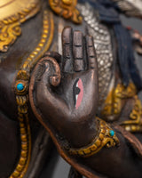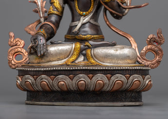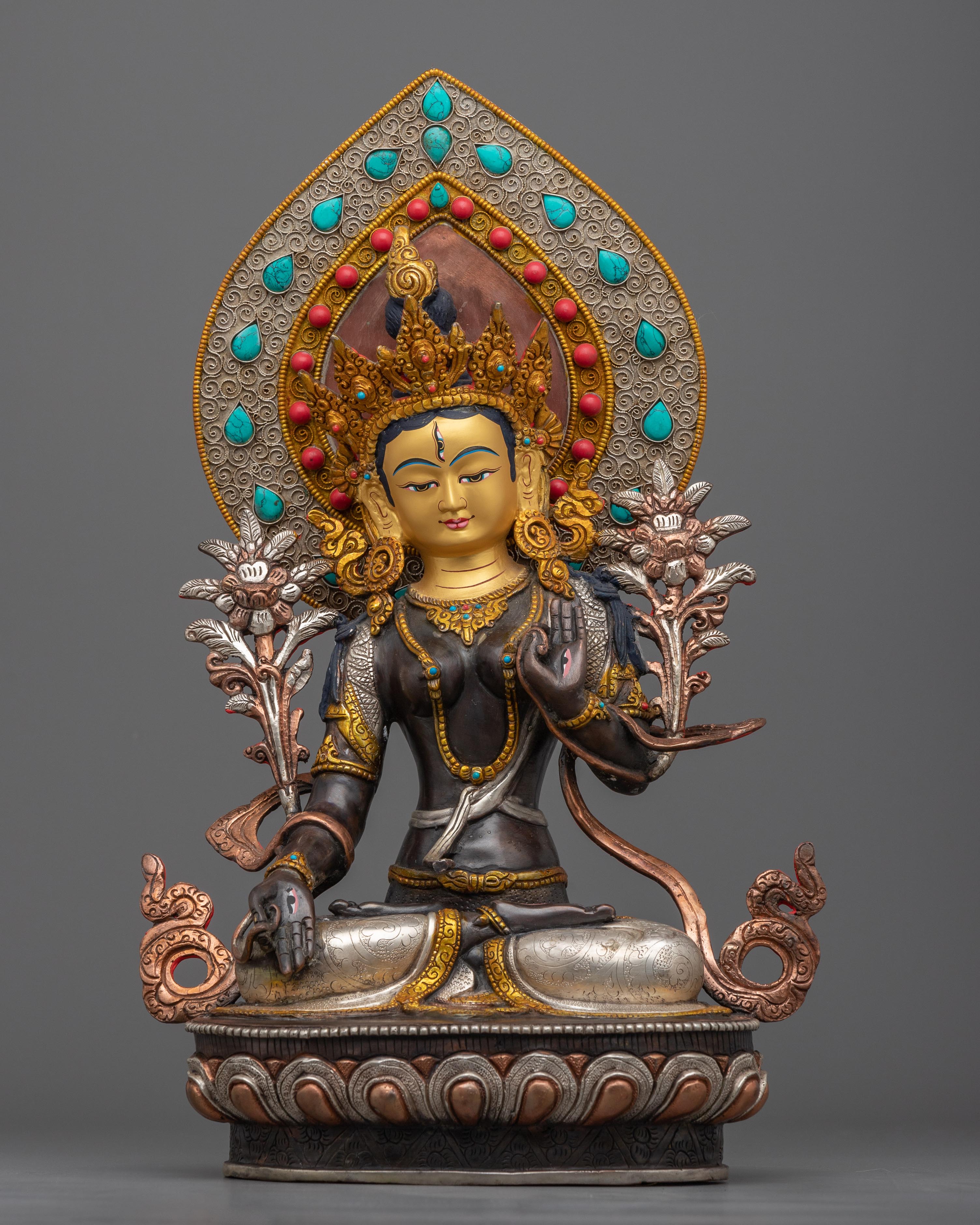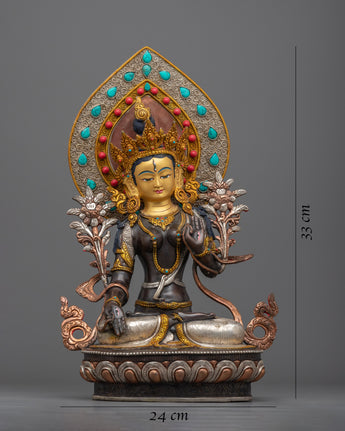 Integrate this magnificent 12.9-inch statue of Buddhism Tara to elevate your spiritual practice and living area with her calming and caring presence. This high-quality statue was painstakingly created in Nepal utilizing the age-old lost wax casting technique. It features an oxidized copper body with opulent 24K gold gilding and silver plating. White Tara's facial characteristics are highlighted by the skillfully executed acrylic paints, which give this outstanding picture depth and beauty. This magnificent statue captures the spirit of White Tara's calm and loving energy, making it perfect for spiritual practice, home décor, altarpieces, cultural appreciation, or gift-giving.