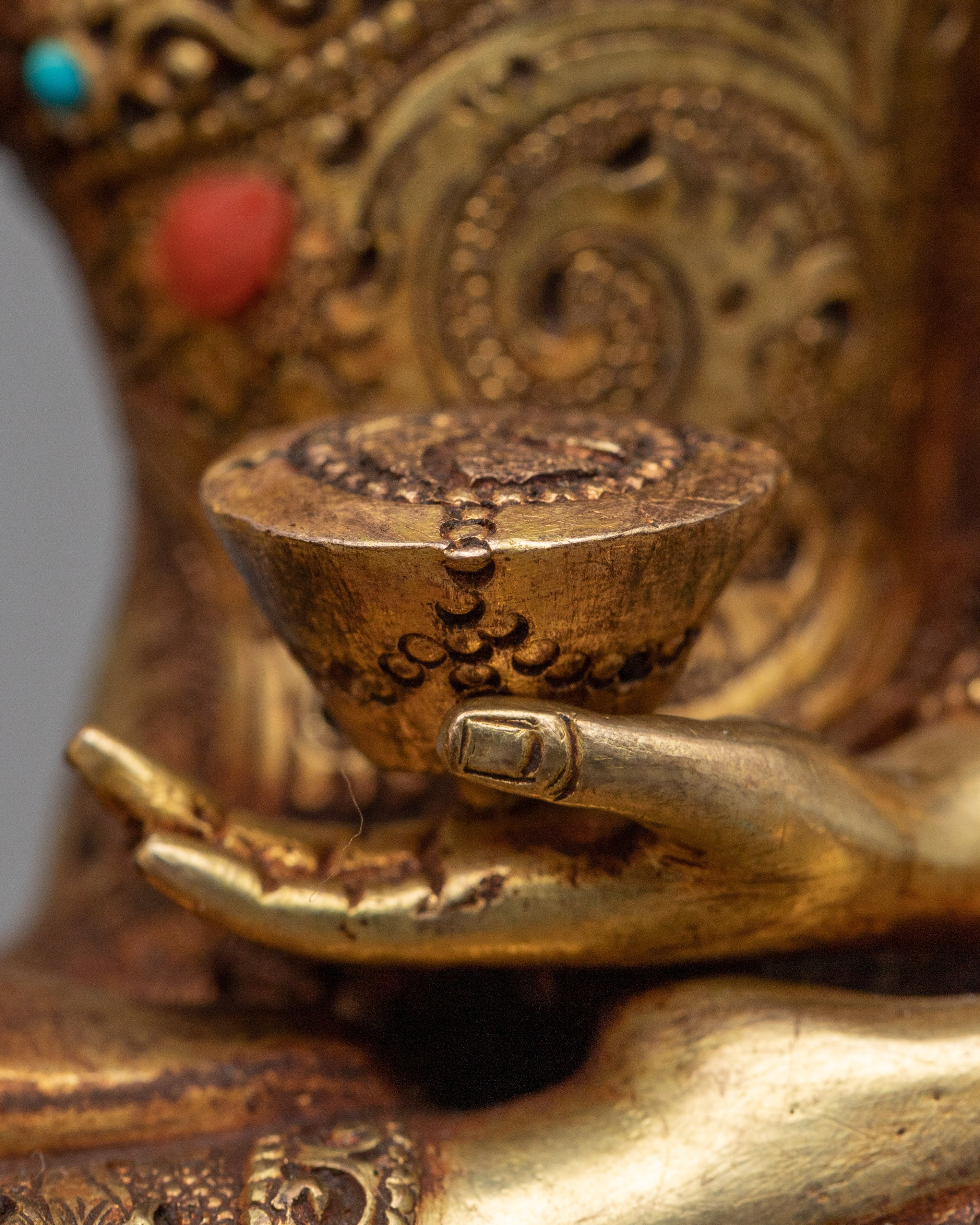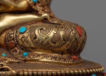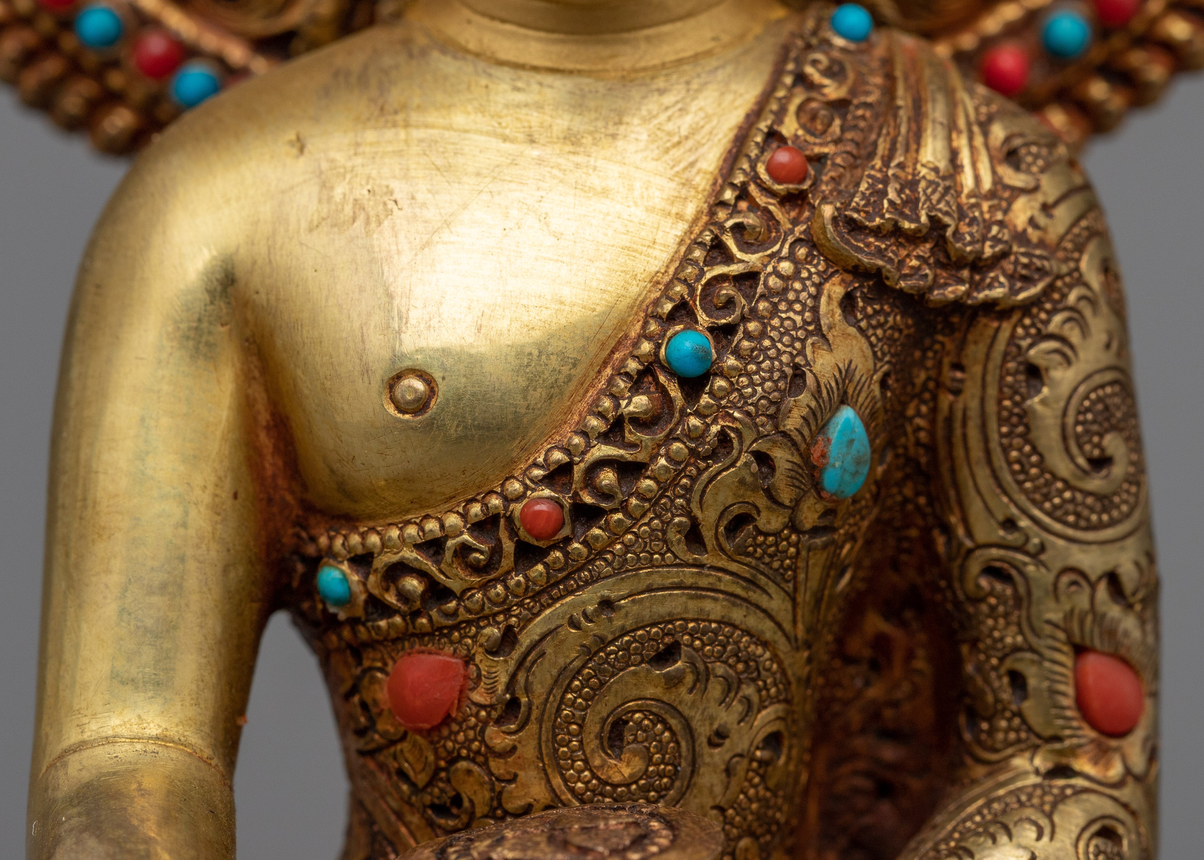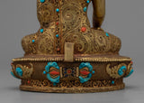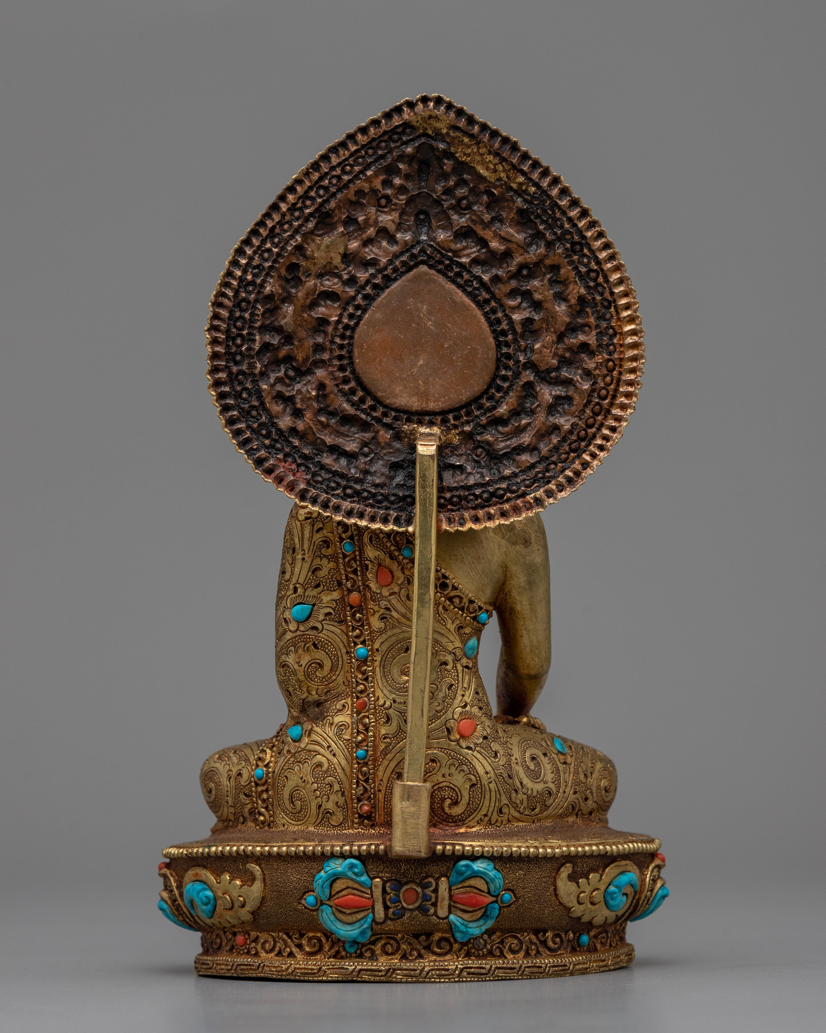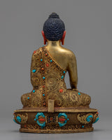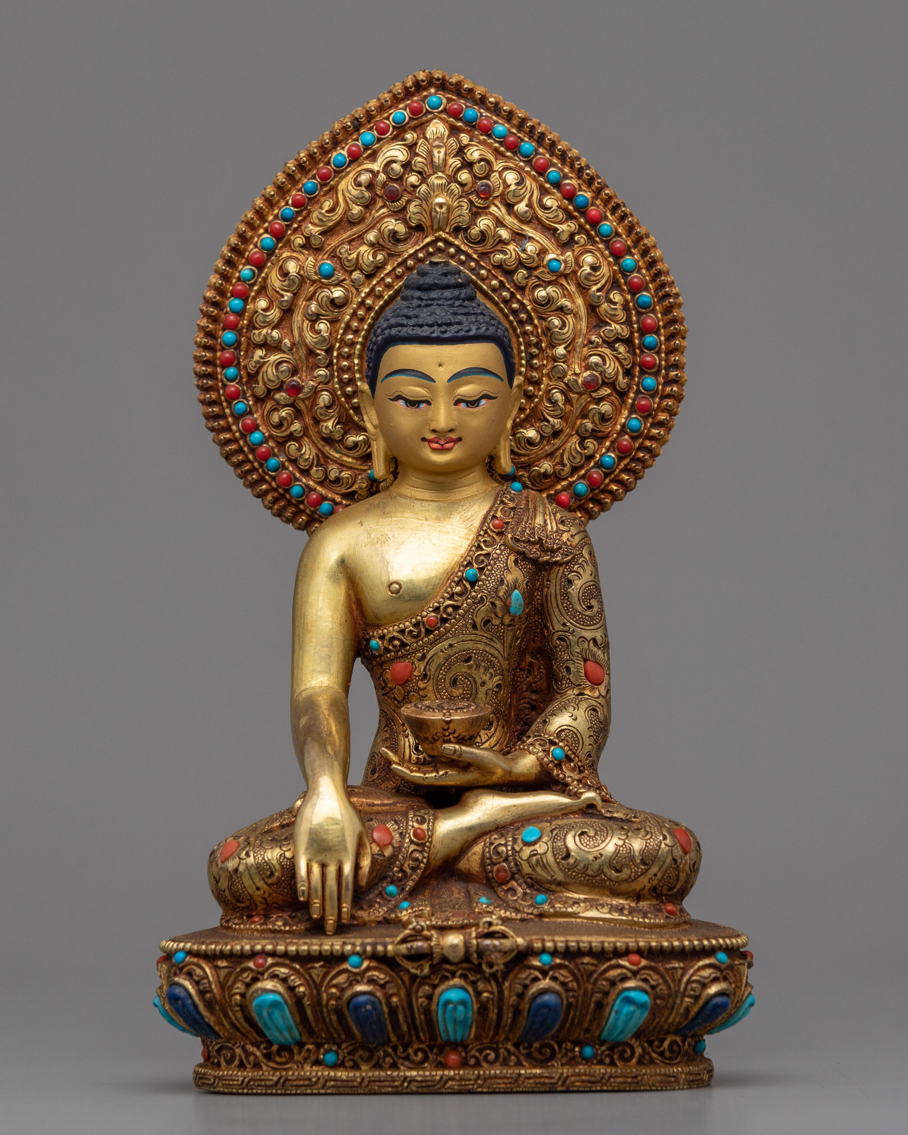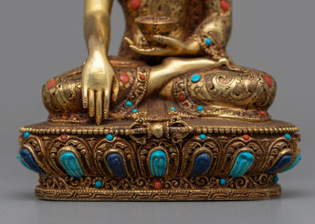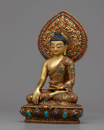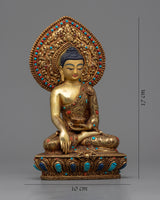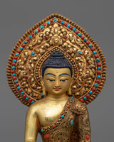 Meticulously handcrafted in our workshop, this Shakyamuni Buddha statue is intricately designed with unique Nepali patterns. The Buddha is depicted seated atop a moon disc lotus seat decorated with intricate hand carvings. He can be seen performing the "Bhumisparsa Mudra," which symbolizes the moment the Buddha awakened, claiming the earth as his witness while holding an alms bowl in his left hand, a symbol of renunciation of earthly pleasures. The gold-plated halo ornated with precious gemstones placed behind Shakyamuni Buddha in the statue emphasizes his tranquil and sublime look.