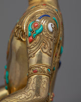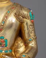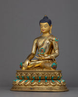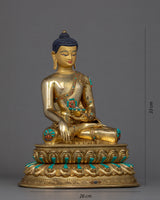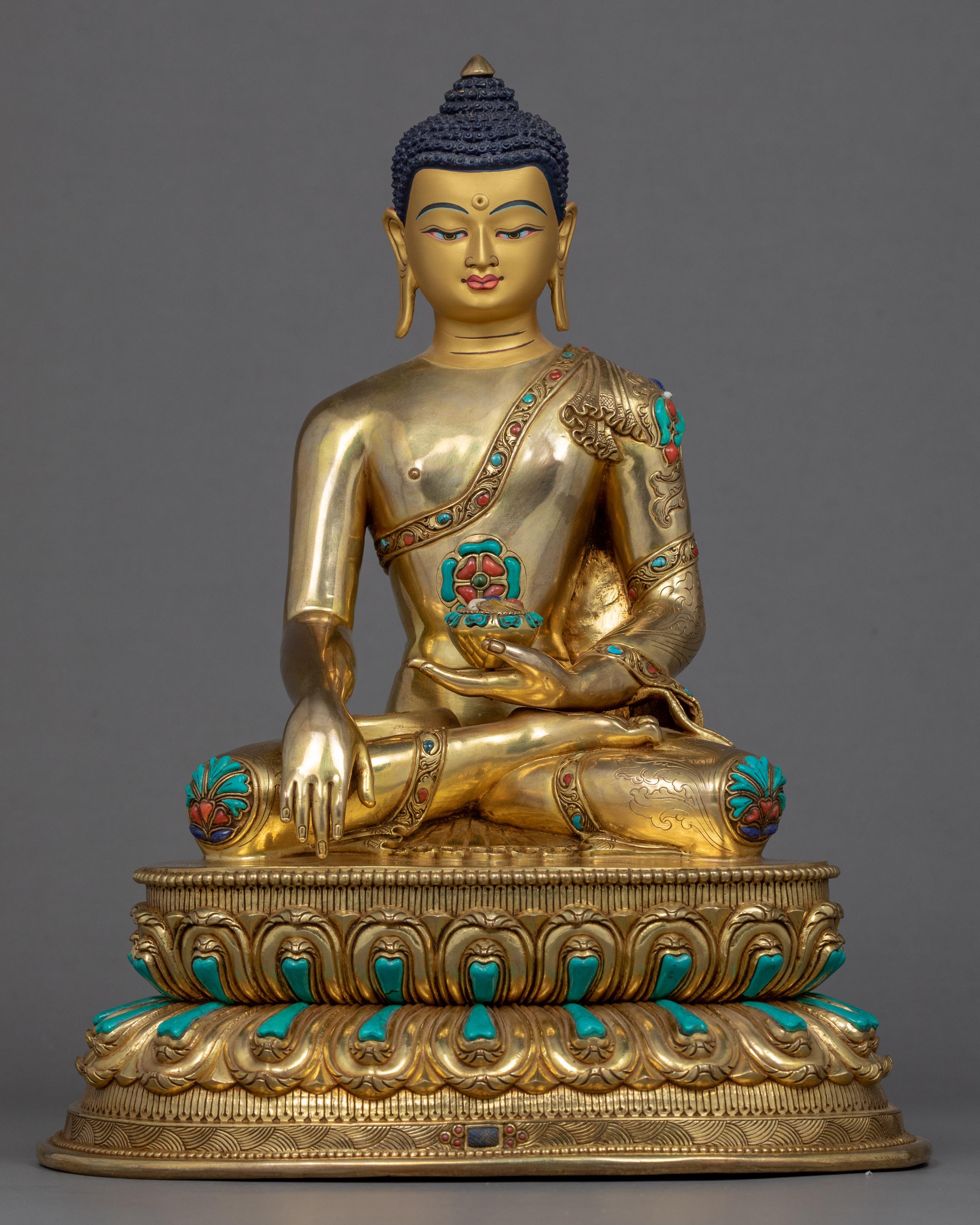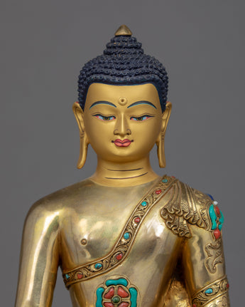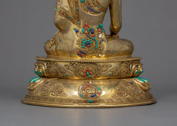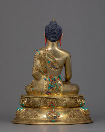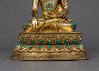 We have exquisitely hand-carved the statue of Shakyamuni Buddha in the traditional Himalayan Art of Nepal. You can use this statue in your daily meditational or yoga activities and even for various Buddhist auspicious occasions. We have magnificently adorned the robe with precious turquoise and corals. We have depicted Buddha seated atop a moon disc lotus seat, hand crafted in pure copper body and gilded with 24k gold. The Lotus seat, artistically designed and turquoise with precious gems, is mesmerizing. This indoor sculpture will be a tremendous gift from Nepal to a practitioner like you.