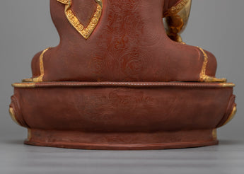 The statue, made of a sturdy oxidized copper body, emanates ageless knowledge and enduring strength. The oxidized finish lends the sculpture an aged, venerable appearance, connecting the present to the rich history of Buddhist art.