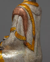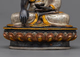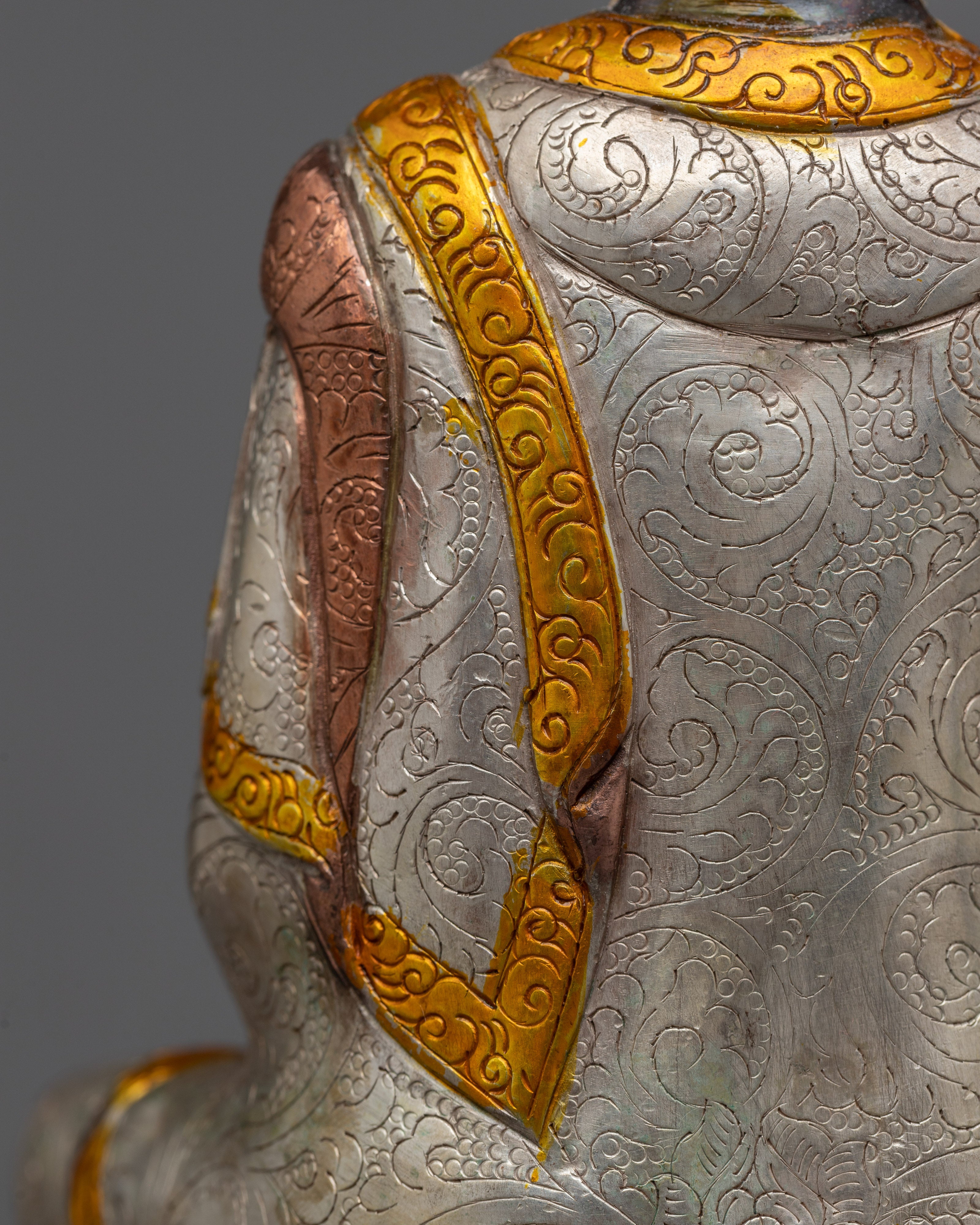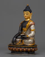 Handmade in a copper body, the statue's face is painted with 24k gold powder, and Buddha's robe is silver plated. He is depicted sitting atop a lotus seat with a calm expression. His right hand is downward in the earth-touching gesture (bhumisparsha mudra), with which he calls the earth goddess Sthavara to affirm that he is entitled to attain enlightenment, and in his right hand, he holds an alms bowl.