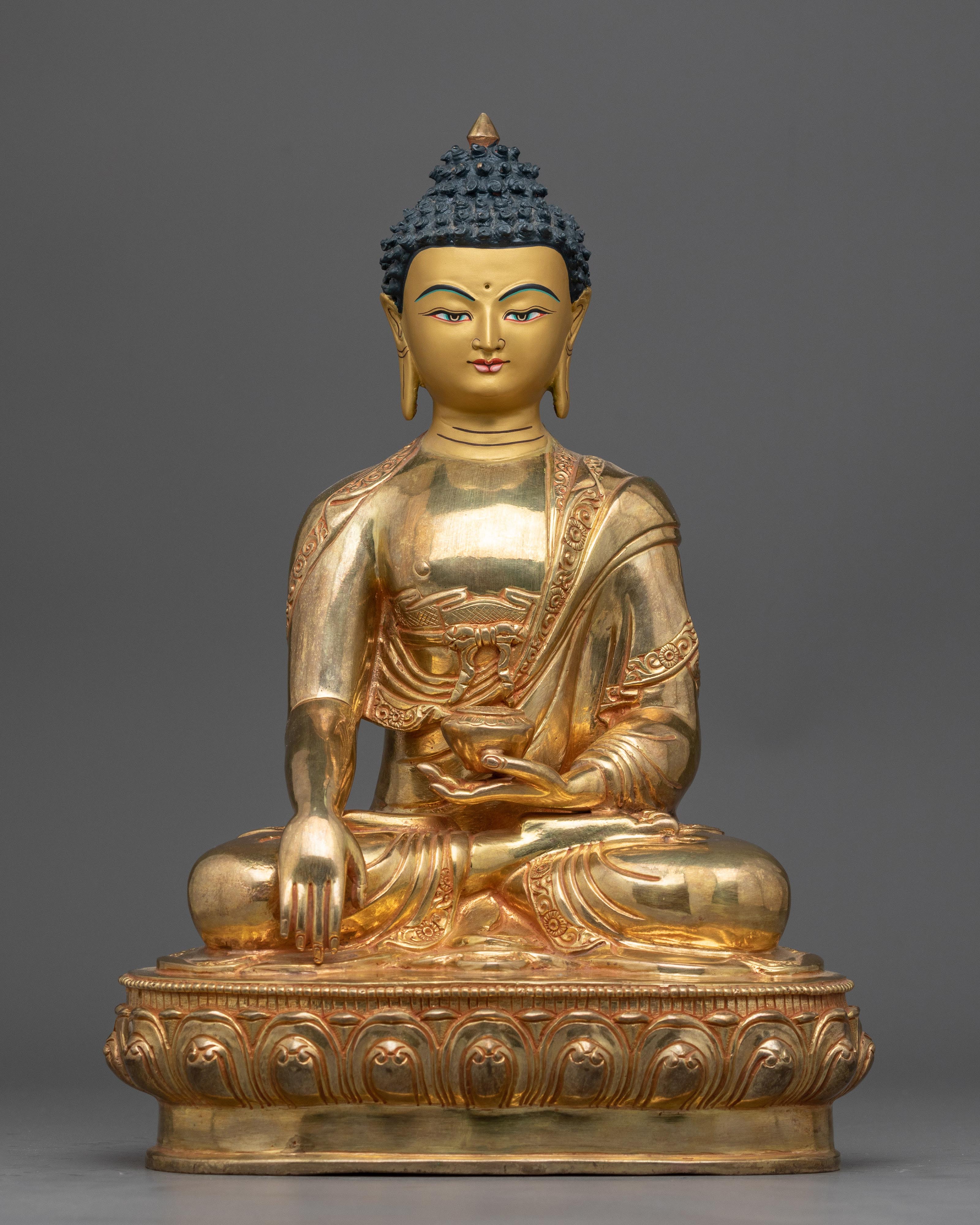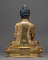 The sculpture, which shows Shakyamuni Buddha in the traditional meditation stance, exudes the calm and profound wisdom of the Buddha. The 24K gold gilding illuminates the figure, symbolizing the pure, illuminating light of the Buddha's teachings that continue to guide practitioners on the path to enlightenment. The detailed paintings add layers of depth and texture, bringing to life the Buddha's compassionate gaze and the intricate folds of his monastic robes.