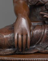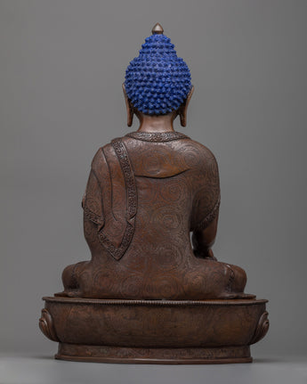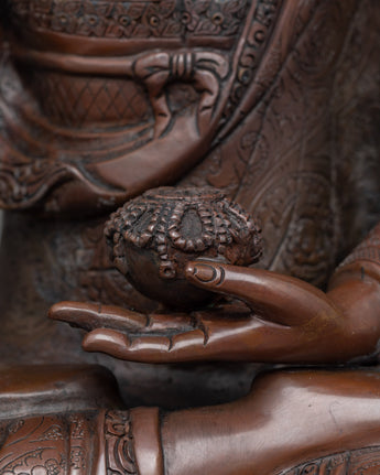 A master artist from Nepal sculpted this beautiful statue, the statue stand 17.7" in height. The statue was sculpted in copper alloy. He is depicted sitting on a moon disc of a lotus seat with a calm look on his face, holding an alms bowl, and his right hand is on earth touching mudra.