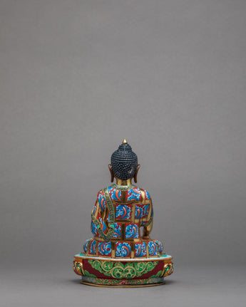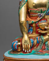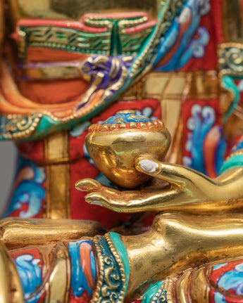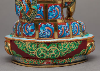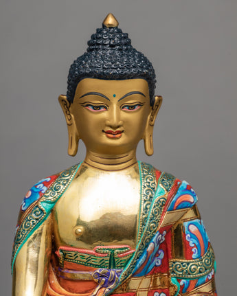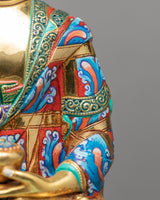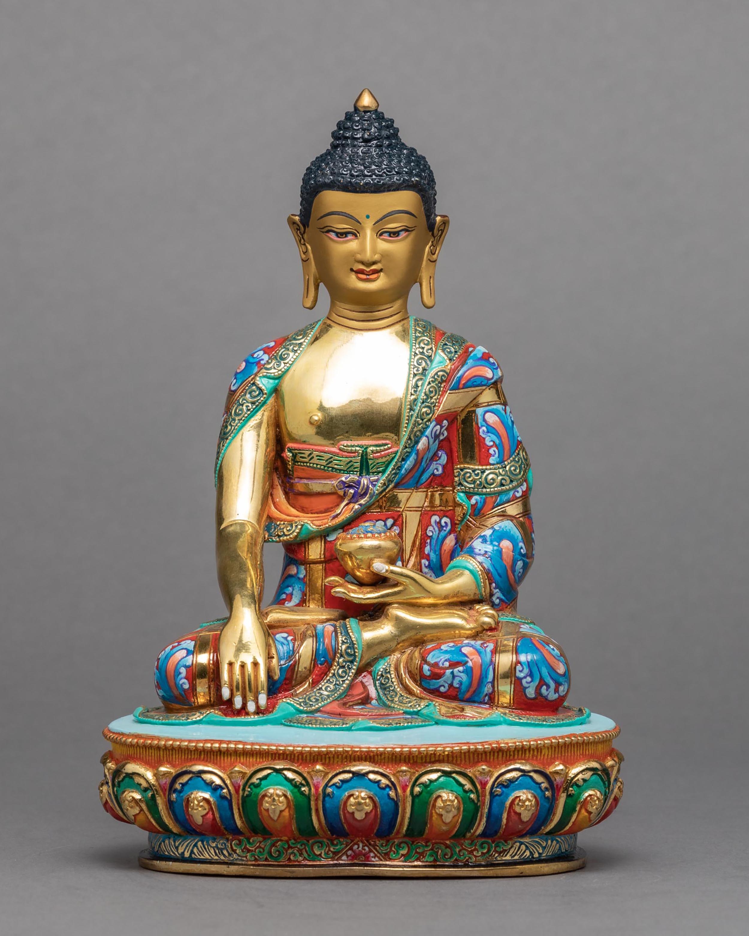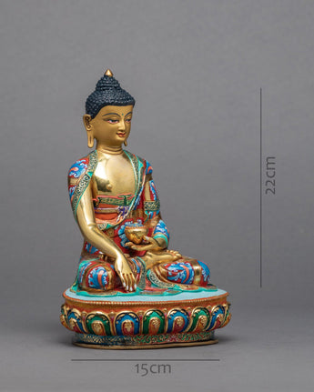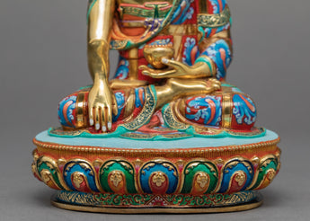 Shakyamuni Buddha is another name for Gautama Buddha. This statue artwork is made of copper with gold plating and acrylic paint. A serene and peaceful face is shown in this sculpture, which is seated in a vajra stance on a multicolored lotus seat. His body is covered in a colorful robe, with his right hand in mudra on the ground and his left hand resting on a begging bowl. The large and gorgeous extended earlobes signify a deliberate rejection of the earthly world in favor of spiritual knowledge. Above the head, the artistic Ushnisha is handmade, indicating Buddha's wisdom, The statue consists of triple-Layered Gold, 3D Embossed Carving with Deep Multi-Layered Engraving, and High-Quality Semi-Precious Hand Carved Stones.