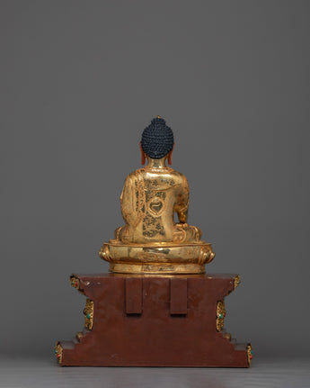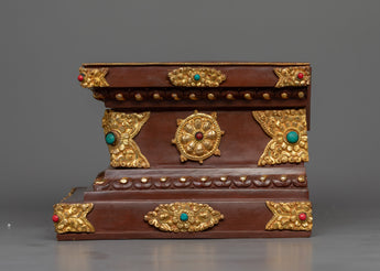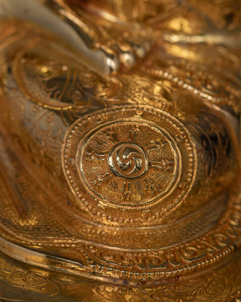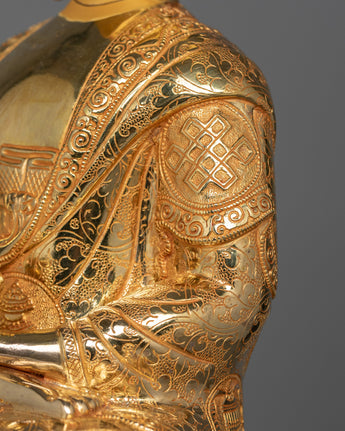 With a bright and divine appearance, this excellent statue set is skillfully crafted from a copper body and embellished with 24K gold gilding. Behind the figures is a stunning halo in the shape of a tree, representing vitality and the connectivity of all beings. The green leaves symbolize development, kindness, and growing wisdom, while the blossoms on the tree provide beauty and reflect the flowering of knowledge and compassion. The throne foundation is meticulously crafted with gold-gilded designs that emphasize the sacred and majestic character of the statues. With a weight of 15.33 kg, this set is substantial and perfect for any area used for spiritual development, meditation, or introspection.